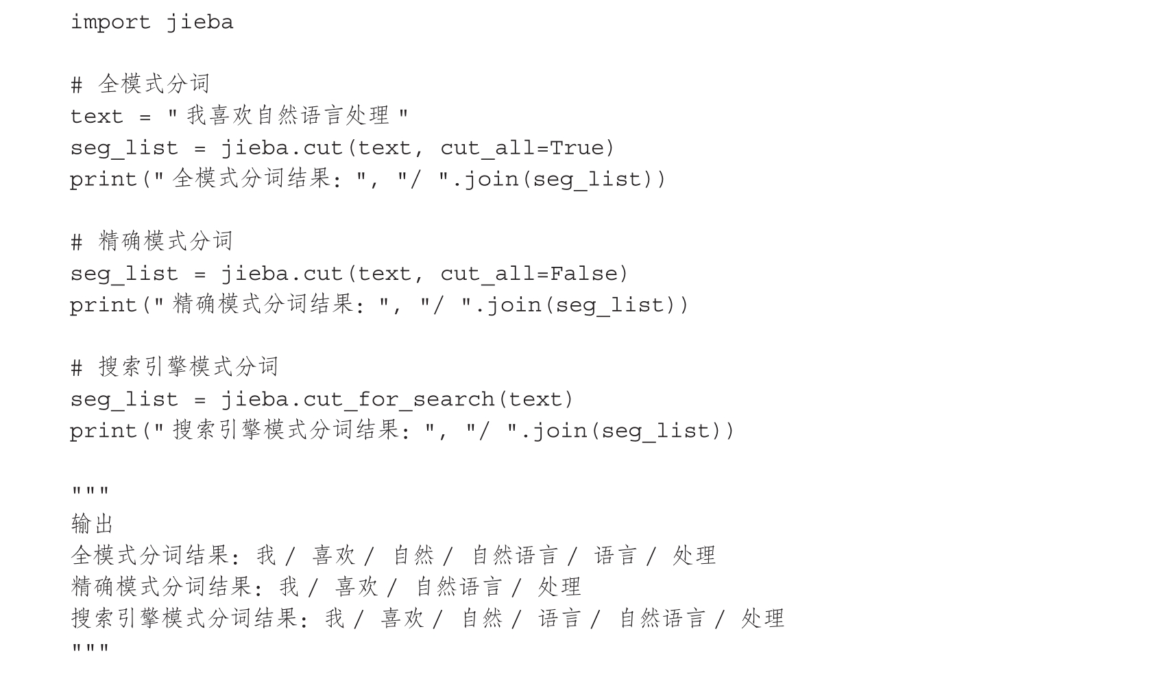 在这个例子中,jieba.cut()方法接收一个字符串作为输入,并返回一个生成器,生成分词后的结果。