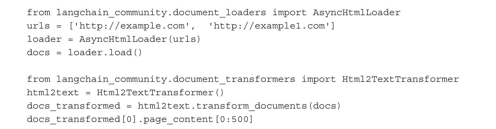 对于直接请求的网页内容,有时会包含大量的网页HTML标签。如果将这些标签直接输入LLM,一方面会增加数据的噪声,影响生成质量;另一方面会增加token的成本。因此,我们需要对这些无意义的标签进行简单的清洗。可以使用LangChain提供的HTML2Text来实现这一目的。HTML2Text可以直接将HTML内容转换为纯文本(类似Markdown的格式),不需要进行任何特定的标签操作。通常,它与AsyncHtmlLoader配合使用。