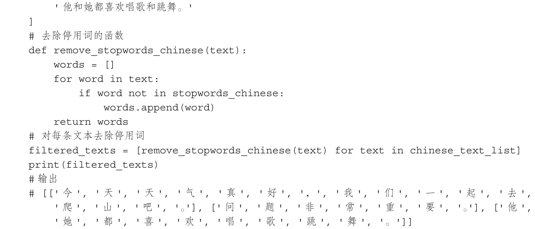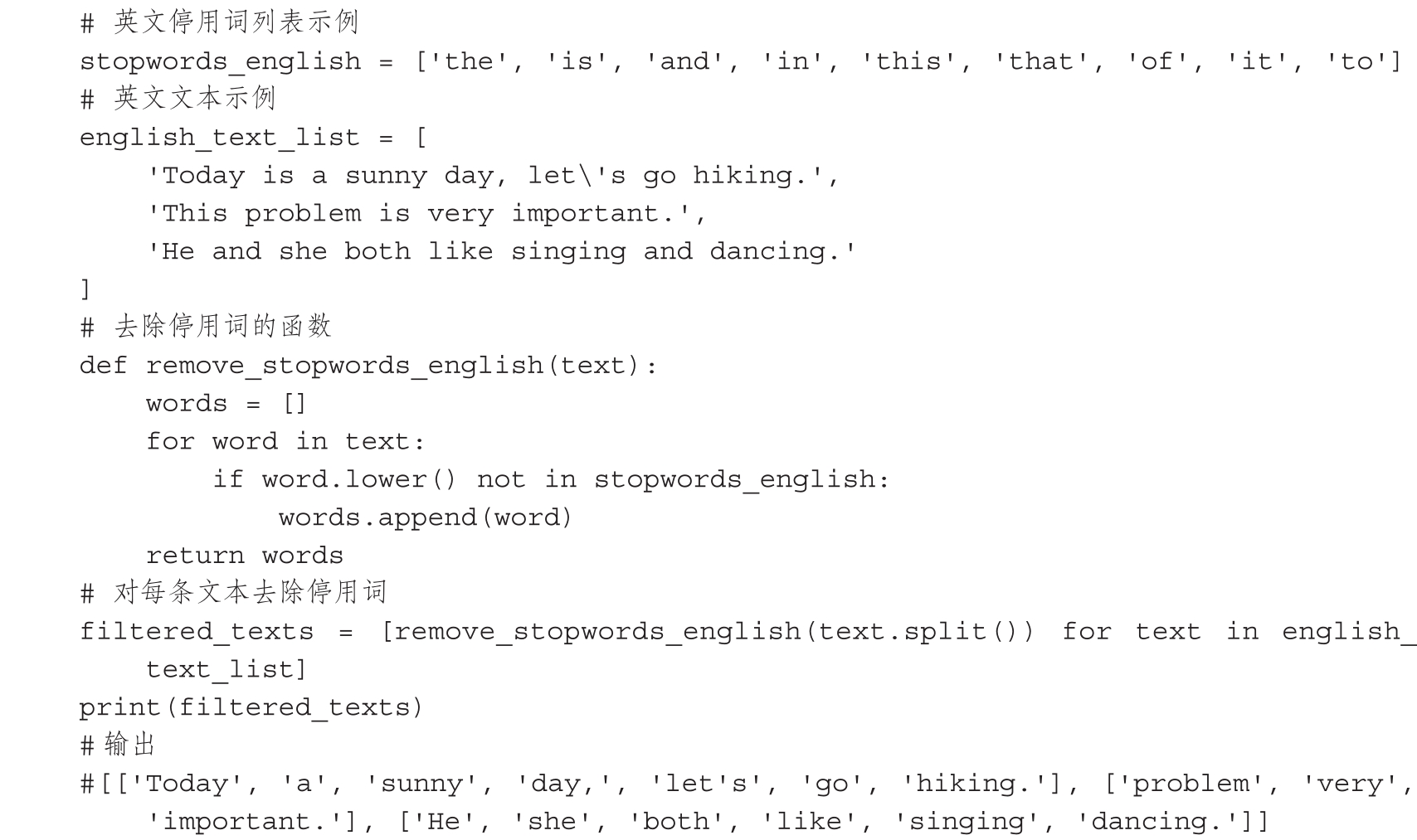 停用词 通常是一些常见且在语境中没有特定含义的词,如“的”“是”等。在文本标准化过程中,去除停用词有助于减少噪声,提高文本特征的质量。下面是两个去除停用词的示例。