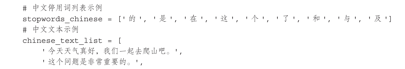 假设我们有一个中文文本列表chinese_text_list,以及一个中文停用词列表stopwords_chinese。
