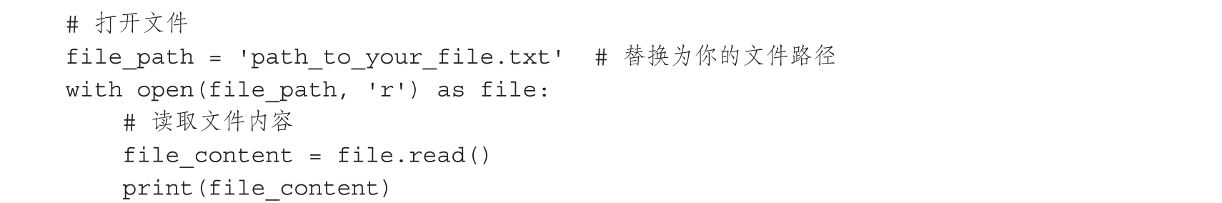 在Python中读取文本文件(.txt文件)时,我们可以直接使用open()函数和read()方法。具体步骤是,使用open(file_path,'r')打开指定路径的文件,并使用with语句确保文件在使用完毕后自动关闭。file.read()方法会将整个文件的内容作为一个字符串返回,然后你可以对这个字符串进行进一步处理或打印。