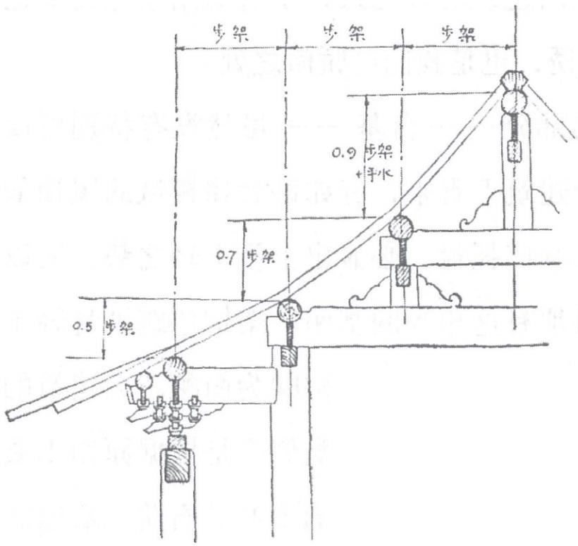 这斜度之由来是依着梁架叠层的加高,这制度称作“举架法”。这举架的原则极其明显,举架的定例也极其简单,只是叠次将梁架上的瓜柱增高,尤其是要脊瓜柱特别高。