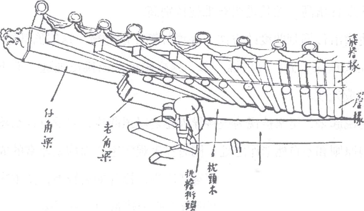 角梁是方的,椽为圆径(有双层时上层便是方的,角梁双层时则仍全是方的)。角梁的木材大小几乎倍于椽子,到椽与角梁并排时,两个的高下不同,以致不能在它们上面铺钉平板,故此必须将椽依次地抬高,令其上皮同角梁上皮平。在抬高的几根椽子底下填补一片三角形的木板,称“枕头木”,如图二。