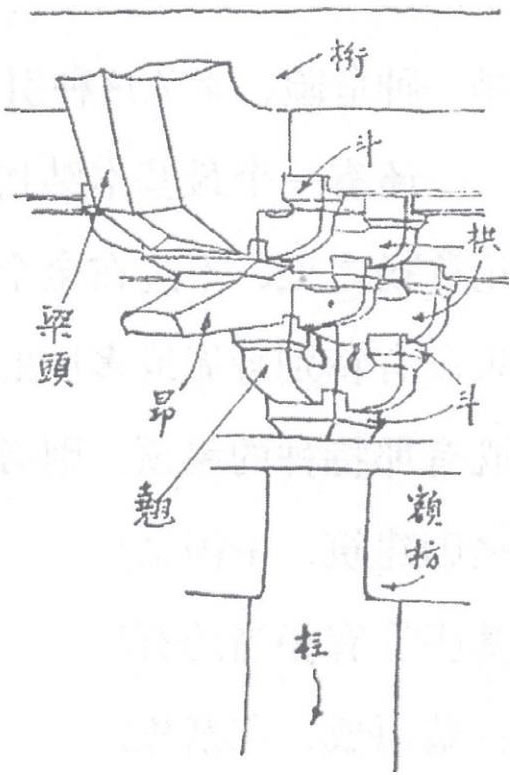 中国建筑的第二个显著特征,并且与屋顶有密切关系的,便是“斗栱”部分。最初檐承于椽,椽承于檐桁,桁则架于梁端。此梁端即是由梁架延长,伸出柱的外边。但高大的建筑物出檐既深,单指梁端支持,势必不胜,结果必产生重叠的木“翘”支于梁端之下。但单藉木翘不够担全檐沿的重量,尤其是建筑物愈大,两柱间之距离愈远,所以又生左右岔出的横“栱”来接受“檐桁”。这前后的木翘,左右的横栱,结合而成的“斗栱”全部(在栱或翘昂的两端和相交处,介于上下两层栱或翘之间的斗形木块称“枓”)。“昂”最初为又一种之翘,后部斜伸出斗栱后用以支“金桁”,如图四。
