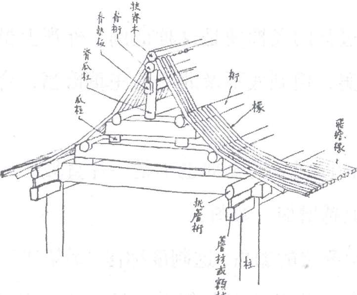 木造结构,我们所用的原则是“架构制”(Framing System)。在四根垂直柱的上端,用两横梁两横枋周围牵制成一“间架”(梁与枋根本为同样材料,梁较枋可略壮大。在“间”之左右称柁或梁,在间之前后称枋)。再在两梁之上筑起层叠的梁架以支横桁,桁通一“间”之左右两端,从梁架顶上“脊瓜柱”上次第降下至前枋上为止。桁上钉椽,并排栉篦,以承瓦板,这是“架构制”骨干最简单的说法。