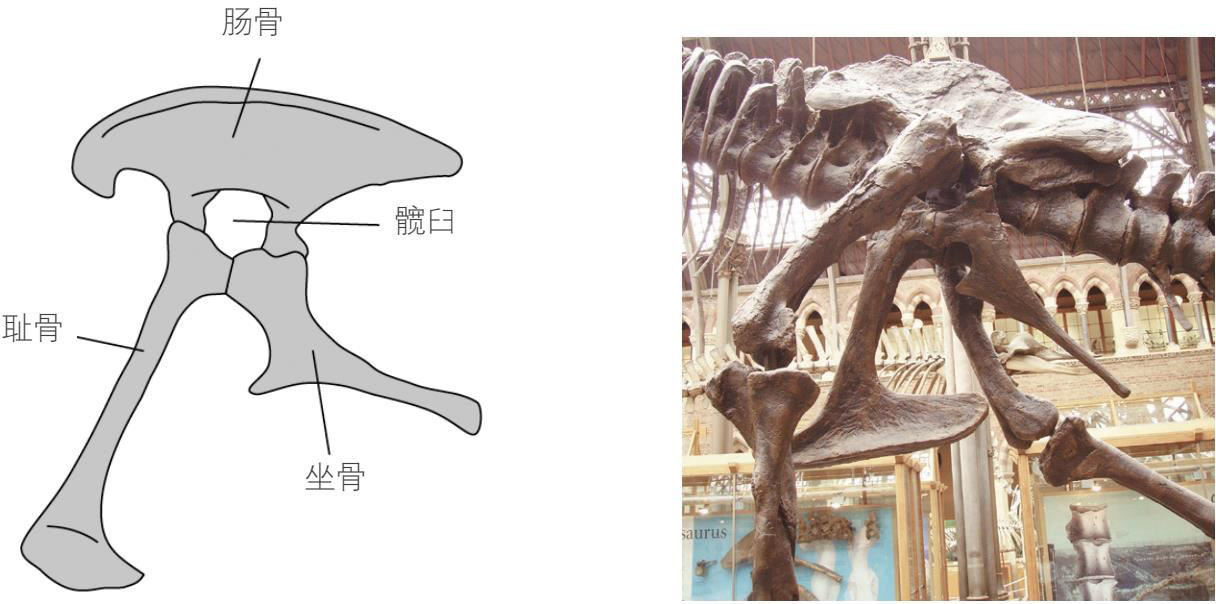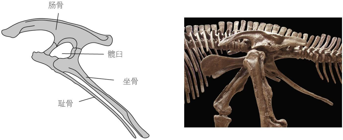 而在鸟臀类恐龙的绝大多数成员中,臀部的耻骨与坐骨均向身体的后腹方延伸,两者之间形成近乎“二”字形的平行走向——这与鸟类的臀部结构类似。