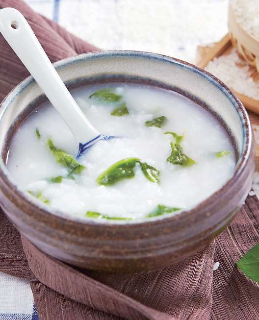 3.粥熟后放入菠菜段,继续煮至菠菜熟软,加入盐调味即可。