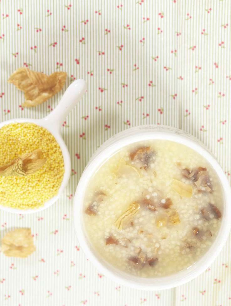 3.粥熟后放入香菇块,继续煮至香菇熟软,加入盐、味精调味即可。