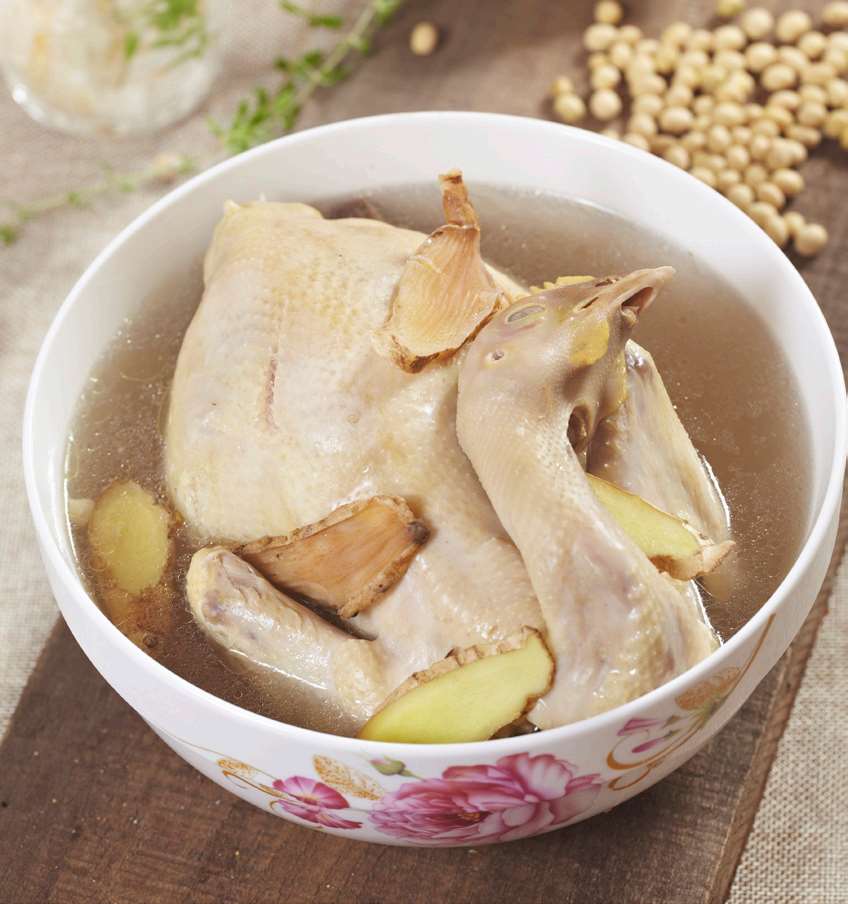 2.将老母鸡收拾干净,放入锅中,加入适量清水和姜片,将老母鸡炖至熟烂。