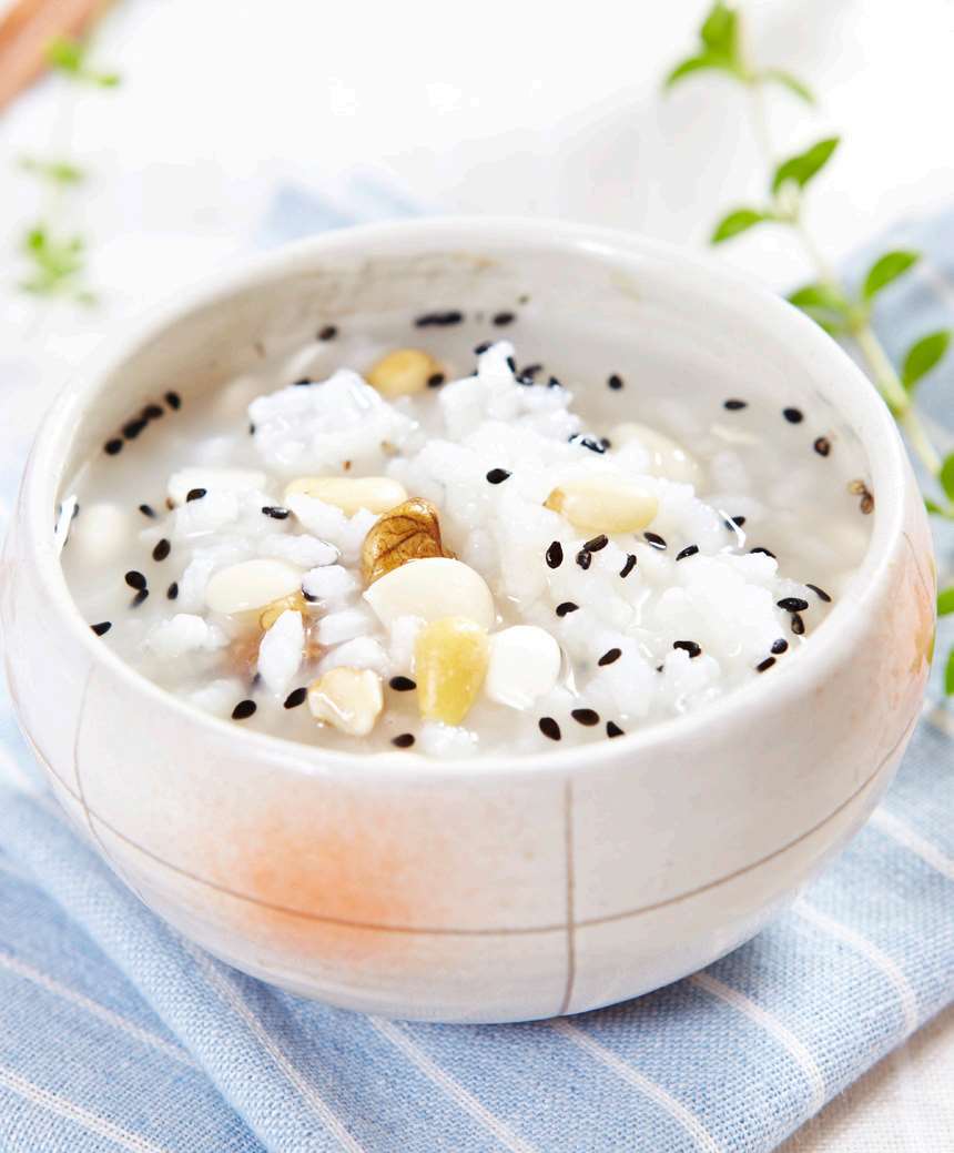 做法: 将芝麻、松子仁、柏子仁、胡桃仁、甜杏仁放入水中浸泡30分钟,浸软后放入锅中,加入适量清水,放入大米,煮成粥,服用时加入白糖调味。