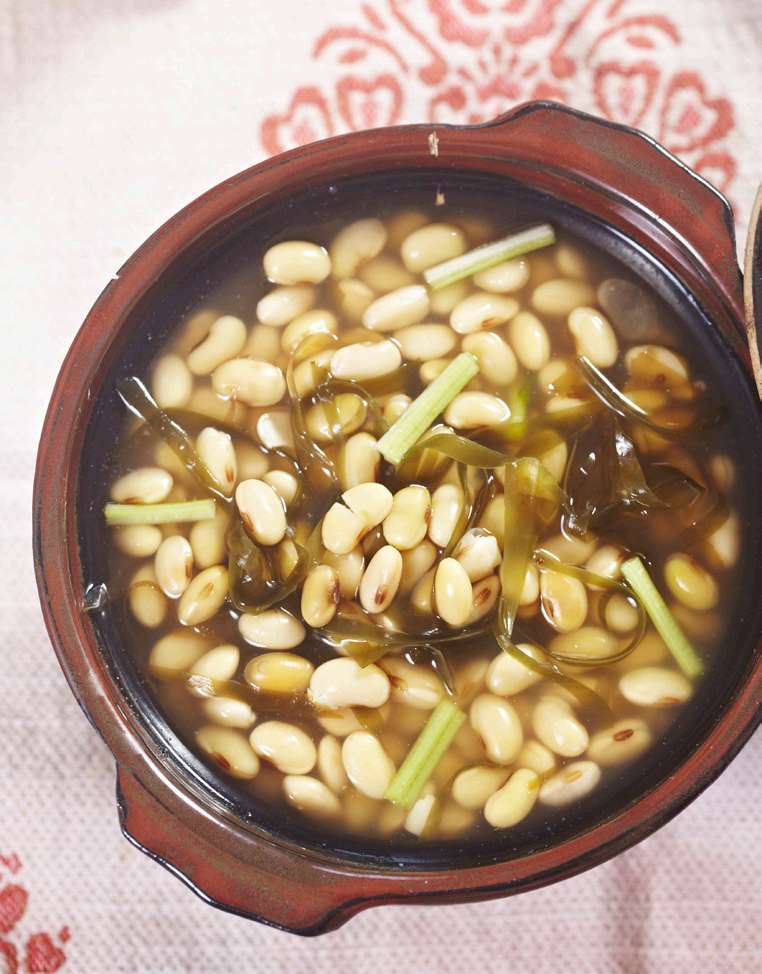 2.水发海带洗净,切丝。芹菜择洗干净,切段,与泡好的黄豆、海带丝一同放入锅中煮汤,煮熟后放入盐,淋上香油即可。