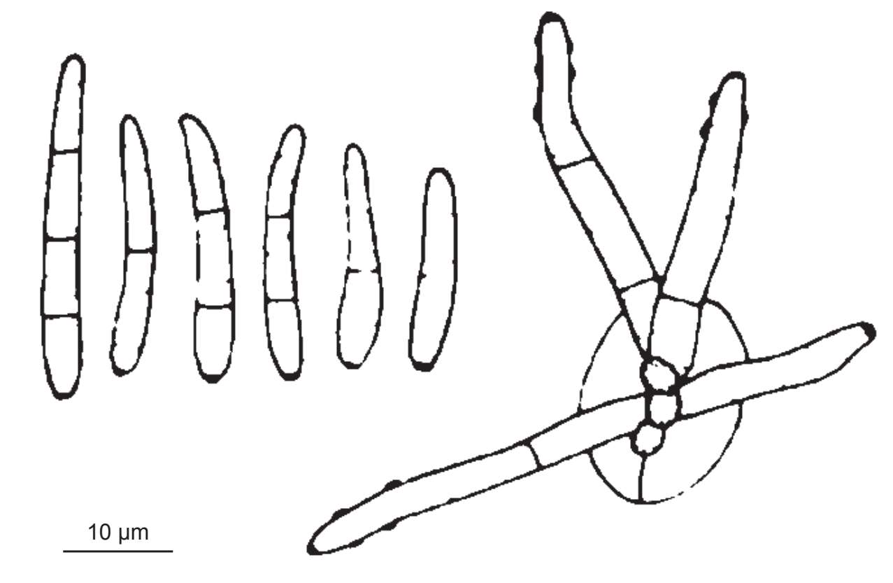 形态特征 │斑点现于叶的正背两面,点状、近圆形、角形至不规则形,无明显边缘,受叶脉所限,宽1~5毫米,常多斑愈合;叶面斑点红褐色、灰褐色至暗红褐色,具浅黄褐色晕;叶背斑点褐色至暗褐色,具黄褐色至浅红褐色晕。子实体生于叶背面。无子座。分生孢子梗单根或2~6根从气孔伸出,青黄色至浅青黄褐色,向顶色泽变浅,宽度不规则,有时基部较宽,直立或稍弯曲,不分枝或偶具分枝,近顶部稍呈屈膝状,顶部圆形至圆锥形,0~2个隔膜,不明显,6.5~45微米×3~5微米。孢痕疤小而明显,稍加厚,坐落在圆形至圆锥形顶部或平贴在分生孢子梗壁上,宽1~1.7微米。分生孢子倒棍棒形、倒棍棒形至圆柱形,浅青黄色,直立或稍弯曲,顶部圆至钝,基部倒圆锥形平截,0~3个隔膜,12~45微米×2.3~3.5微米。