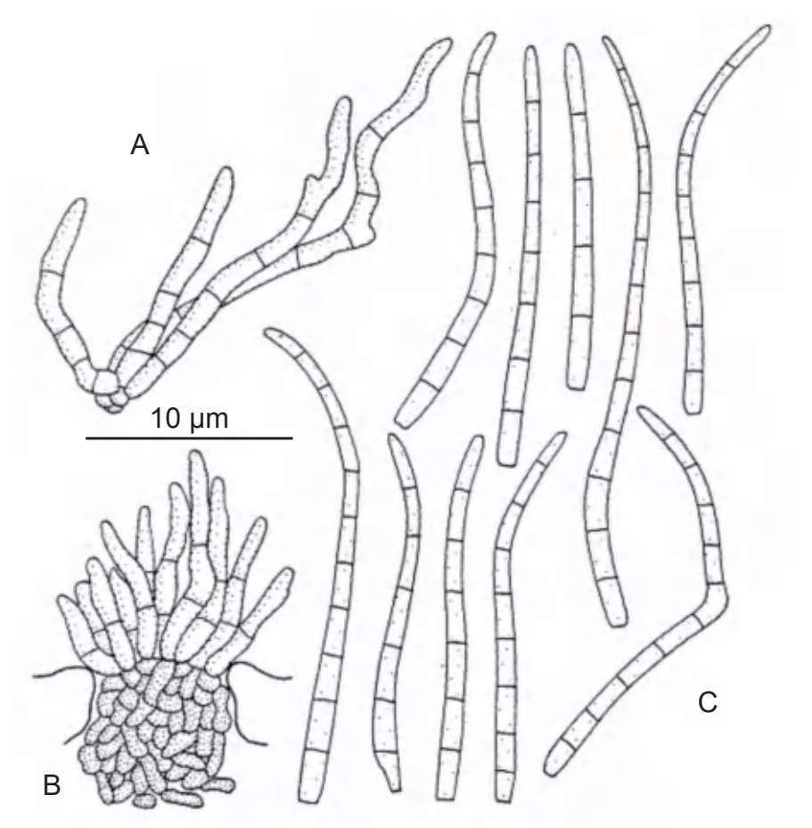 A.分生孢子梗束;B.生于球形梗座的分生孢子;C.分生孢子