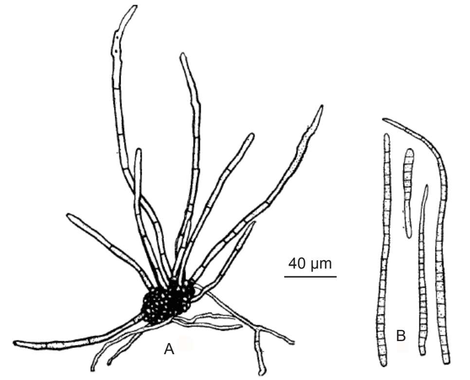 形态特征 │叶斑现于叶的正背两面,近圆形至长椭圆形,黑褐色至暗黑色,外有浅黄色晕圈或围以隆起黄色细线,近圆形斑直径1~7毫米,长椭圆形斑长5~16毫米,宽2~9毫米。子实体叶两面生,但多生于叶背。菌丝体内生和外生,外生菌丝有微疣。梗座着生于气孔表面,暗褐色,半圆形,宽25.3~55.6微米。分生孢子梗2~20根,丛生,深褐色至暗褐色,色泽均匀,宽度规则,正直至弯曲,0~4个折点,不分枝,有时层出套生,顶部近平截或孢痕疤密集于其附近而膨大呈不规则形,或者顶下膨大,其上密集痕达18个,横隔2~12个,43~290.4微米×2.8~6.3微米。产孢细胞不外露或稍外露,多点芽茁在顶部及其附近产孢,或合轴产孢,圆柱形,有孢痕疤;孢痕疤有时特厚并突出,明显,平贴于分生孢子梗侧或坐落于折点处。分生孢子干燥,青褐色,具微疣,针形至倒棍棒形,正直至稍曲,单生,顶部近尖细至近钝圆,基部平截,仅基部有脐,厚而明显,l~20个横隔,30.3~290.4微米×5~7.5微米。