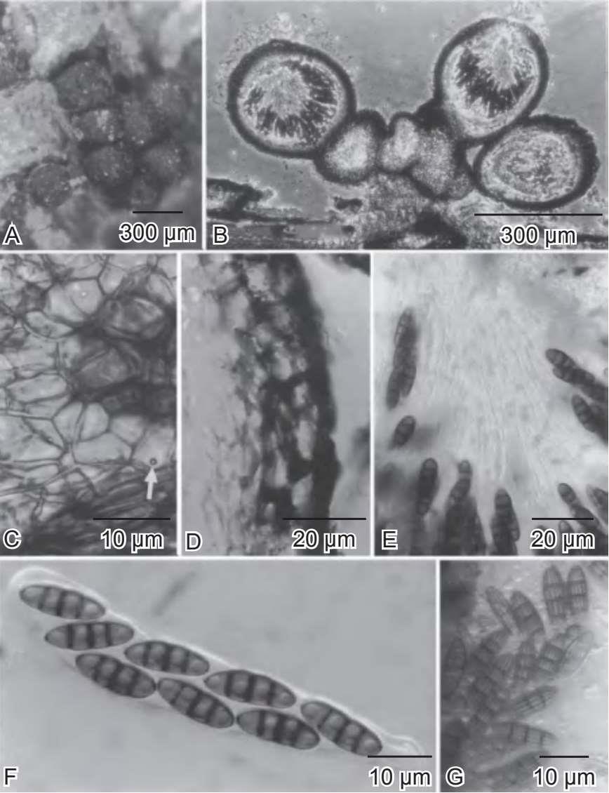 A.子囊座1个聚合体迸出表皮;B.子囊座固定在子囊基上的垂直部分;C.子囊组织的细节,注意蒙克孔状小孔贯穿部分细胞壁(箭头);D.子囊座壁的垂直部分,外层壁包有不规则黑色硬壳;E.有线状拟侧丝的中心腔;F.光段下附有子囊孢子的子囊;G.子囊孢子外观