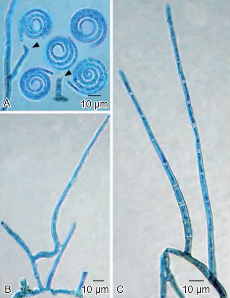 形态特征 │菌落疏展,绒状,白色。菌丝体多数盖于表面,少数深陷,有分叉,有隔膜,由近透明至浅棕色菌丝组成,宽3.5~5微米,光滑。分生孢子巨线状,单线状,单生,直立或略弯曲,光滑,极少分叉,有隔膜,长至250微米,最宽处4.5~6.5微米,顶部收窄。产孢细胞合轴,单芽或多芽,柱状或锥状,顶端平截,宽1.5~3微米。分生孢子全芽,顶生,单生,干,基部平截,光滑,浅棕色,紧密螺旋3.5~4圈,直径27~36微米。分生孢子丝厚2.5~4.5微米,吸湿,30~45个隔膜。