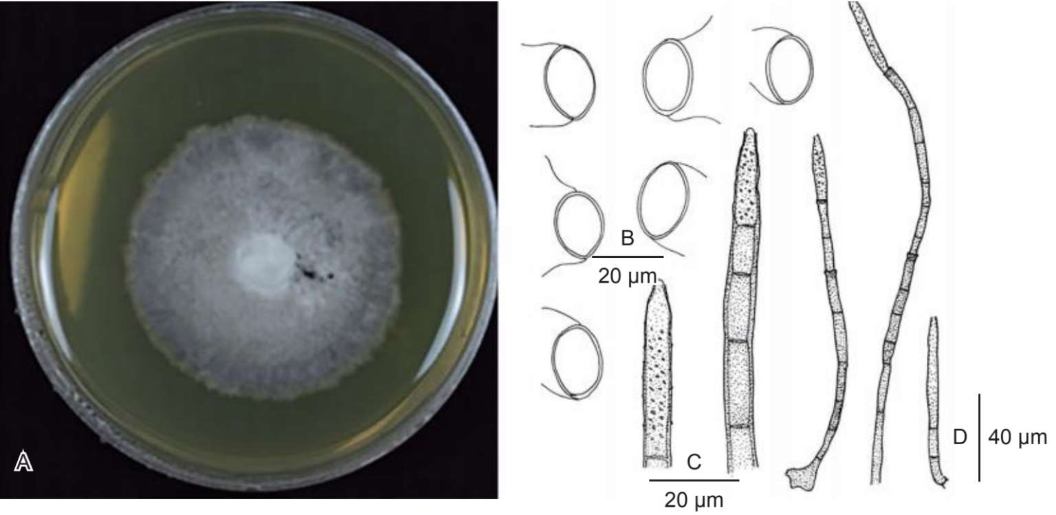 形态特征 │菌落外延,有毛,深棕色。菌丝薄,部分侵入基质,浅棕色至棕色,分枝,有隔。有性型未知。无性型:分生孢子梗200~300微米×4.5~5.5微米,巨线状,单生,直立,直或稍弯曲,圆柱形,深棕色,7~12个隔,光滑,壁厚,穿过囊领在顶部增殖。产分生孢子细胞23~30微米×4~5微米,完整,顶生,圆柱形,浅棕色至棕色,疣状,顶端具一个狭窄的产孢座,没有囊领或有一小囊领。分生孢子15~17微米×11.5~12.5微米,全裂,顶生,单生,近球形,椭圆体,无隔,透明,光滑,每端有一个刚毛状囊状体插入,长8~10微米。培养特征:马铃薯葡萄糖琼脂培养基上菌落外延,20天内直径1.5~2.5厘米,圆形,平整,边缘全缘。气生菌丝发育不良,灰色至灰棕色,边缘淡色,反面同色或稍深。