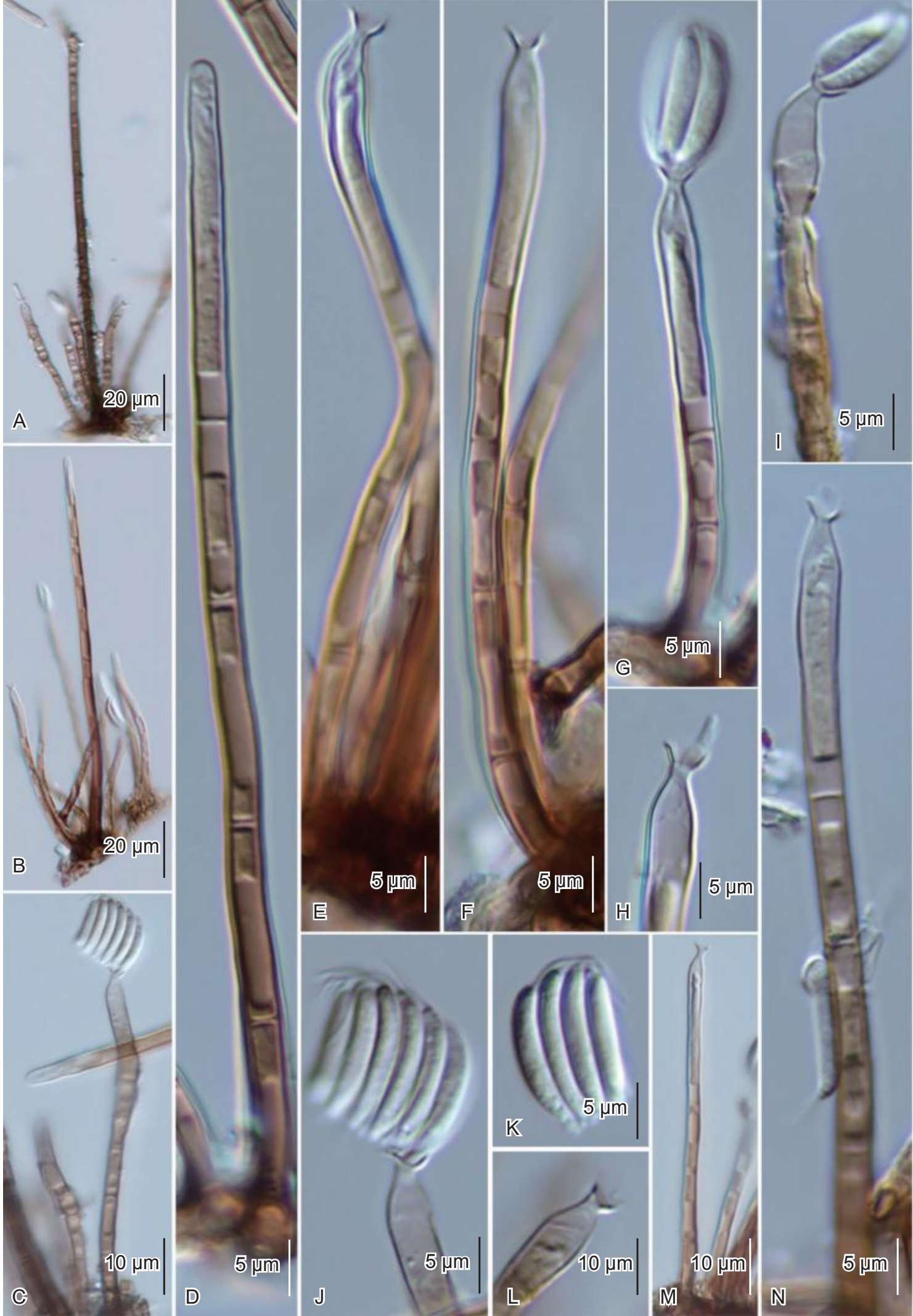 A,B.分生孢子梗;C,E,F,H,I,L~N.分生孢子梗和产分生孢子细胞;D.不育刚毛;G,K.产分生孢子细胞;J.分生孢子
