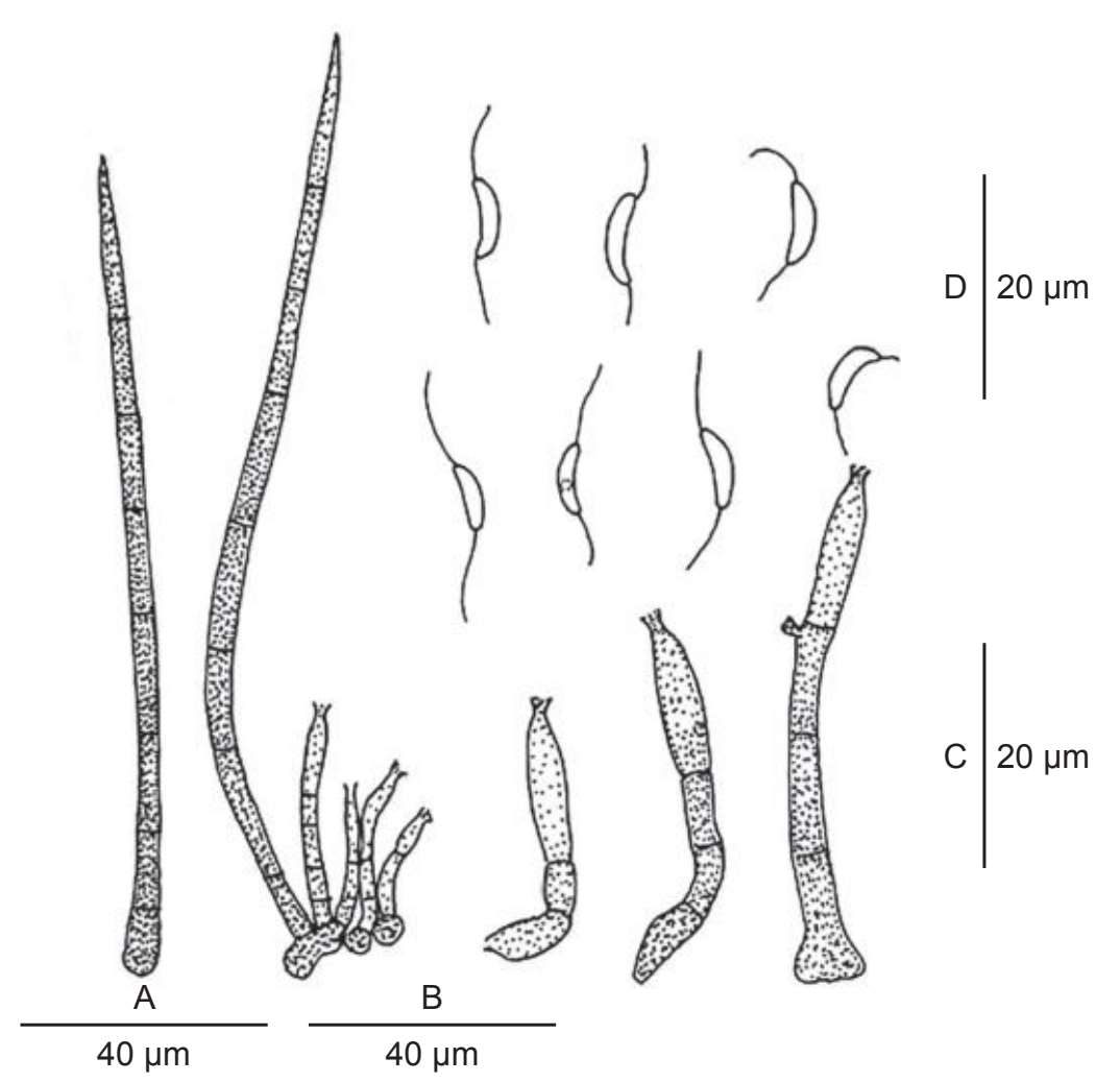 形态特征 │菌落外延,有毛,深棕色。由宽2.5~4微米的棕色菌丝组成,分枝,有隔。有性型未知。无性型:刚毛直生,多为单毛,直立,直或弯曲,柱状,光滑,壁厚,长可达200微米,隆起的基部宽3~4微米,6~8个隔,下部深棕色,顶端锐尖,不育。分生孢子梗30~60微米×2~3微米,巨线状,单生,密,3个环绕于刚毛基部,直立,直或稍弯曲,基部棕色,顶端色变浅,2~4个隔,壁薄,光滑。产分生孢子细胞10~20微米×2.5~3.5微米,完整,基部生,单瓶梗或多瓶梗,柱状,淡棕色,壁薄,囊领漏斗状,宽1.5~2微米,深1~1.5微米。分生孢子6~8微米×1.5~2微米,全裂,顶生,单生,在产分生孢子细胞顶端周围形成小滴,钩状,微弯曲,无隔,透明,光滑,两端锐尖,两端有一刚毛,长5~7微米。