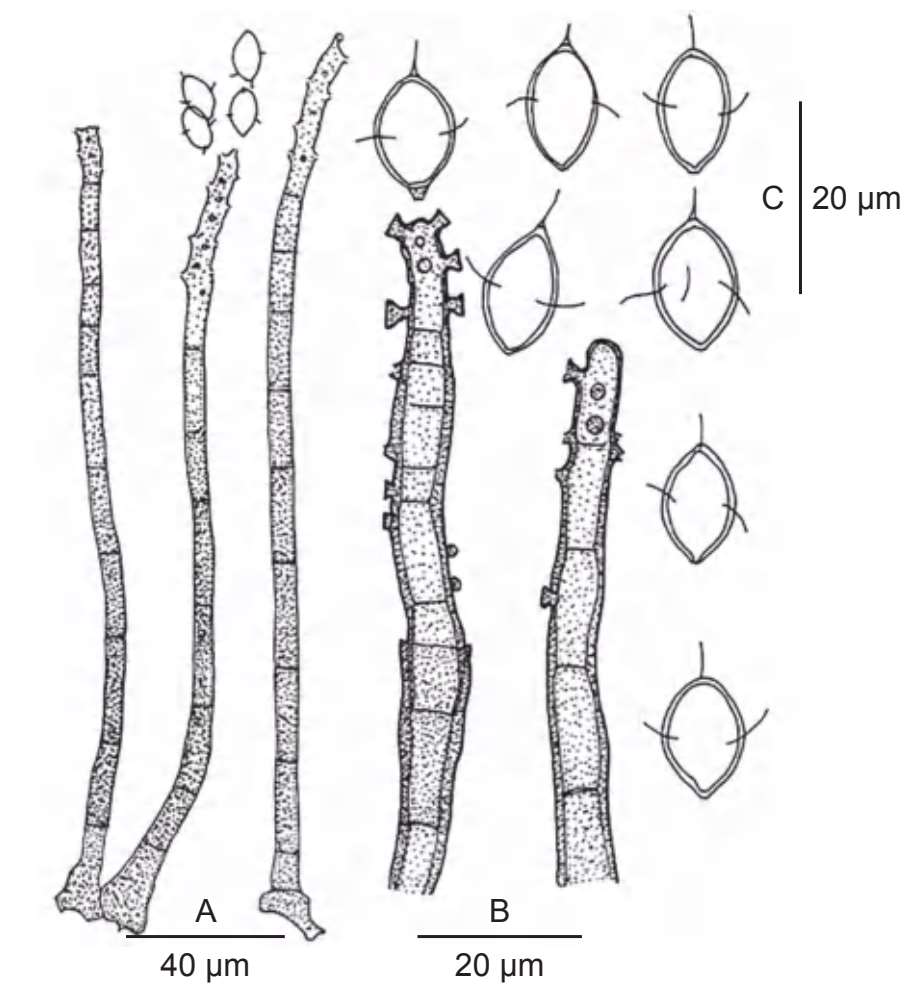 形态特征 │菌落外延,有毛,深棕色。由宽3~5微米的棕色菌丝组成,分枝,有隔。有性型未知。无性型:分生孢子梗200~300微米×6~8微米,巨线状,单生,散生或聚生,直立,直或稍弯曲,基部深棕色,顶端色变浅,7~10个隔,光滑,基部隆起宽至10微米,顶部激增。产分生孢子细胞15~20微米×6~7微米,完整,基部生或中间生,多瓶梗,柱状,淡棕色,壁薄,囊领漏斗状,宽2~3微米,深2~2.5微米。分生孢子13~15微米×8~10微米,全裂,顶生,单生,在产分生孢子细胞顶端周围形成小滴,椭圆状,顶端乳突状,微弯曲,基部钝或平截,无隔,透明,光滑,顶端具一刚毛,2~3个刚毛位于分生孢子中部,长5~10微米。培养特征:在马铃薯葡萄糖琼脂培养基上,菌落外延,20天内菌落直径0.5~1.5厘米,圆形,平整,边缘全缘,气生菌丝发育良好,灰色至棕色,边缘淡色,反面同色或深色。