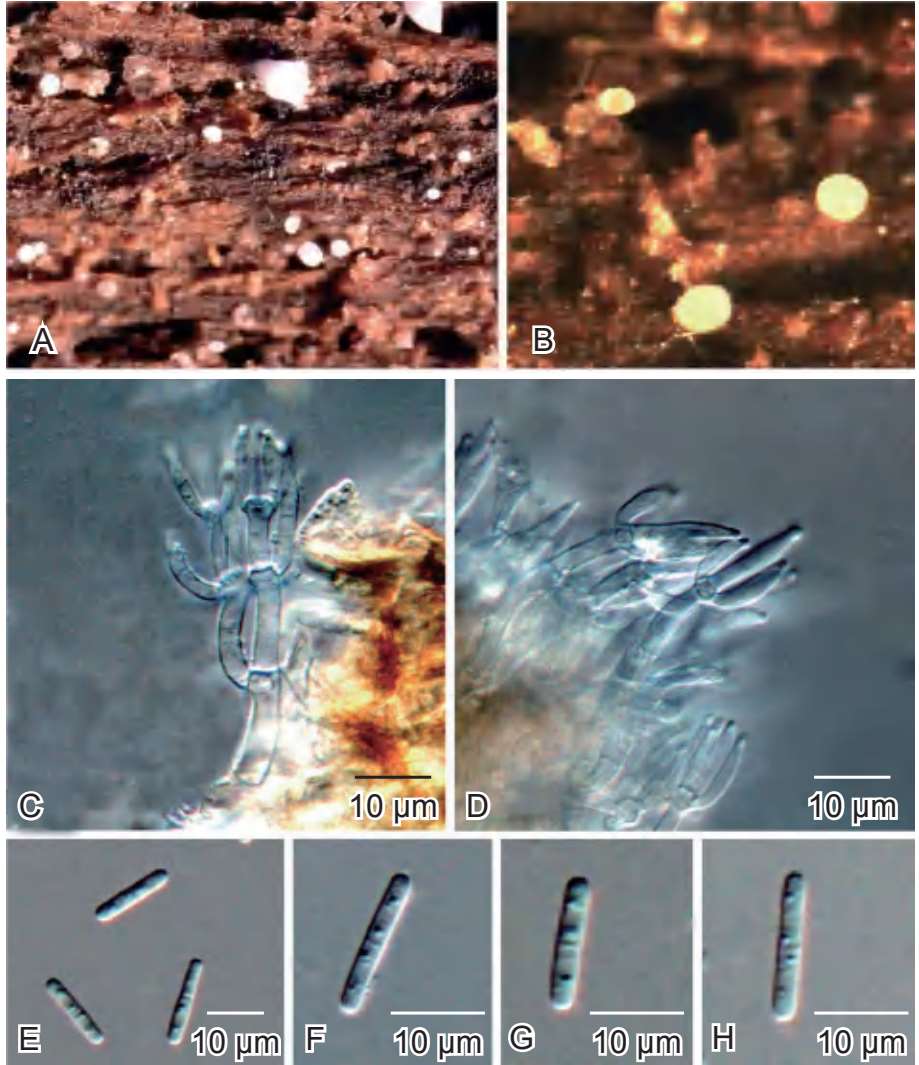 A,B.沉水木头表面的菌落;C,D.流苏状的分生孢子梗;E~H.分生孢子