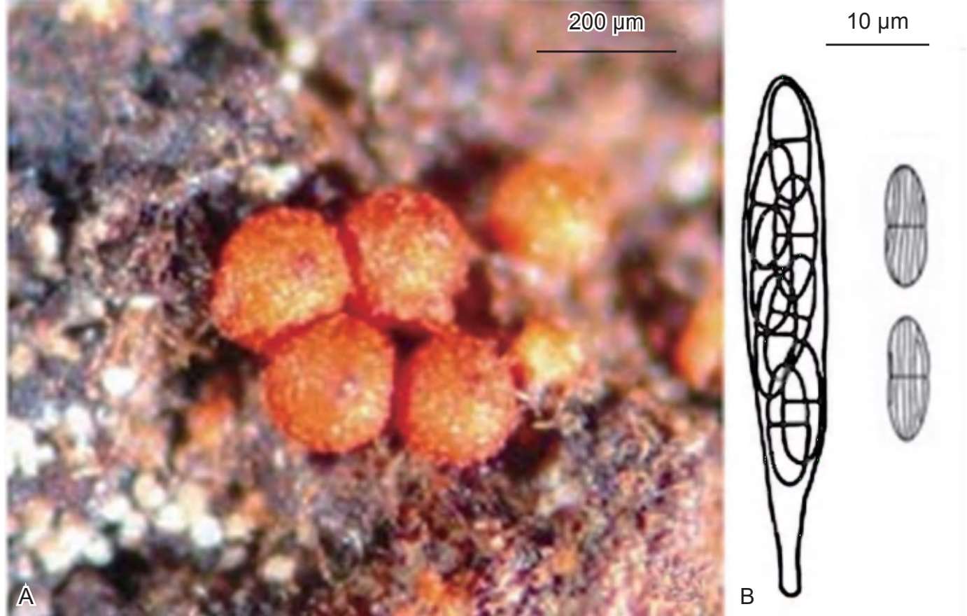 形态特征 │子囊座呈子囊壳状,聚生,一群多达13个,带有底部子座,生于表层,接近球形,高170~290微米,直径160~250微米,附有尖的红色乳突,干后也不萎陷,新鲜时橙红,干后变红色,在3%氢氧化钾溶液中变暗红,在乳酸中由橙色变黄色,微疣状,疣与子囊座同色,高5~18微米,疣中细胞球形至边凸有棱角,6~17.5微米×5~13微米,细胞壁厚1~3.5微米。子囊座壁厚16.5~30微米,分成两个区域,外层区域厚11~24.5微米,细胞球形至边凸有棱角,5~13微米×4~8微米,细胞壁厚1~3.5微米;内层区域狭长形,7~18.5微米×2~4微米,细胞壁厚0.5~2微米。子囊棍棒状,由8个孢子组成,有1个尖端,42~60微米×5.5~11微米。子囊孢子椭圆形至宽纺锤形,在隔膜处微收缩,透明至浅黄色,具细小条纹,分两列连续排列,10~17微米×3.5~6微米。