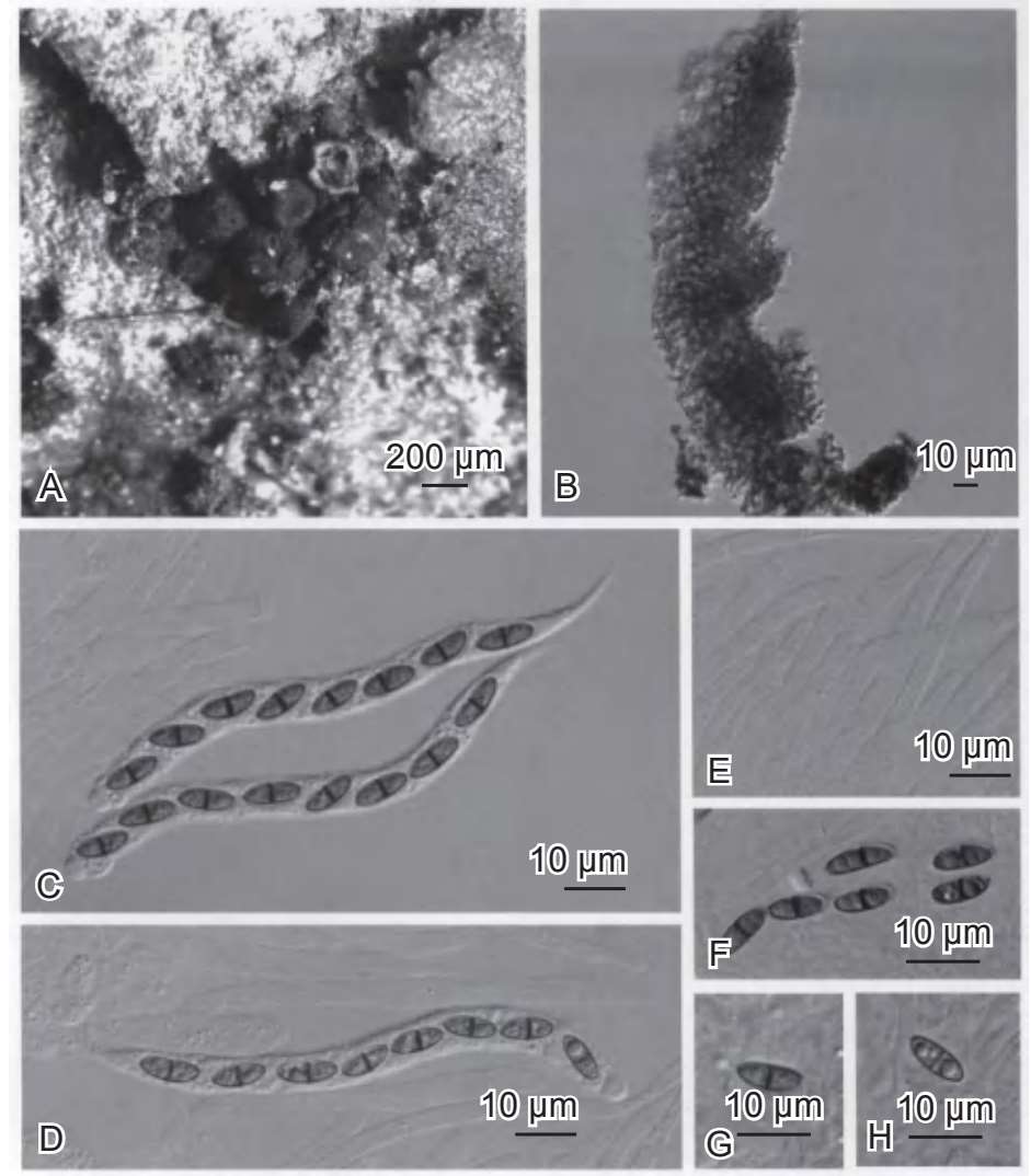 形态特征 │子囊座高200~400微米,直径175~400微米,球形至近球形,生于表面,深褐色至黑色,聚生,有乳突,具孔口。孢囊被宽60微米,纵断面有3层。侧丝宽2.5~5微米,数量多,细丝状,具隔膜,在隔膜处收缩,未嵌入胶状细胞间质中。子囊76.5~97微米×5~8微米,生有8个孢子,圆柱形,短梗,单囊壁,具有折射光的顶生器官,直径3.5~4.5微米。子囊孢子8~10.5微米×3~4.5微米,覆瓦状单列排列,拟纺锤形至纺锤形,顶端尖,1个隔膜,在隔膜处轻微收缩,壁变薄,微绿色至褐色。