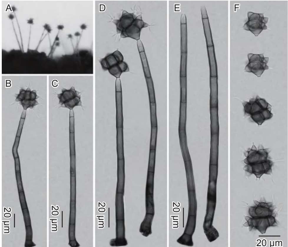 形态特征 │自然培养基上的菌落扩展出来,棕色,绒毛状。菌丝体部分长在表面上,部分陷入基质中,由有分枝、具隔膜、浅棕色至棕色、胞壁光滑的菌丝构成。分生孢子梗粗大,单性,单一,直立,正直或弯曲,光滑,具隔膜,棕色,至顶部色变浅,160~240微米×6~9微米。产孢细胞单核连成一体,顶生,圆柱形至烧瓶形,浅棕色,偶有肠胚基扩展出来,9~14微米×5~5.5微米。大分生孢子破生状脱离,单生,干,顶生,星形,具隔膜,光滑,聚合态,由不规则二室中央体构成,棕色,21~27.5微米×10~17微米,其每个中央细胞能直接产生2个或更多有繁殖力的棕色至浅棕色的外层细胞,其外层细胞4~6.5微米×3.5~4.5微米,能增加1~3个有繁殖力、圆锥形、透明至浅棕色的壁细胞。无性型类似于小月孢属( Selenosporella ),为透明、具隔膜、纺锤状、5~11.5微米×1~1.5微米的小型分生孢子,合轴产生于大分生孢子外围细胞尖端的微小齿状突起。