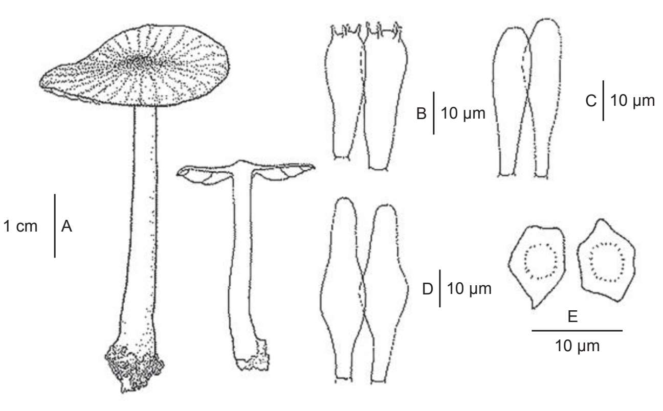A.子实体;B.担子;C.褶缘囊状体;D.侧生囊状体;E.担孢子