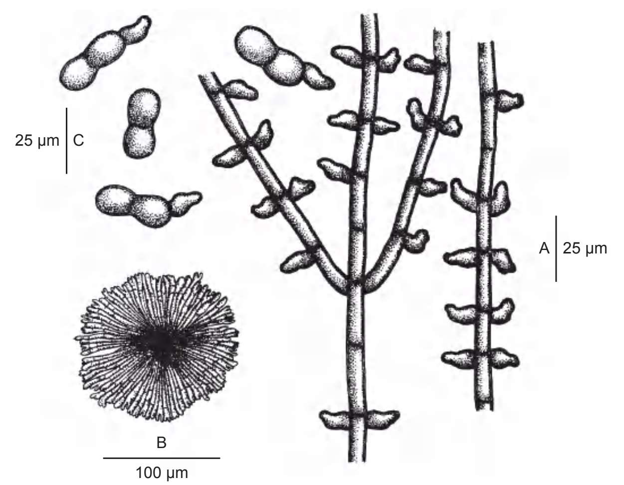 A.菌丝具附着枝;B.盾状囊壳;C.子囊孢子