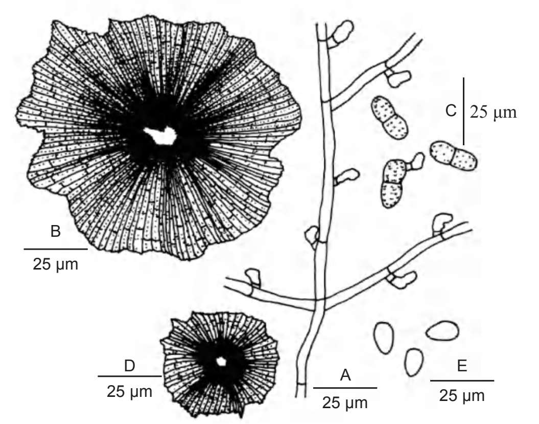 A.有附着胞的菌丝;B.盾状囊壳;C.子囊孢子;D.分生孢子器;E.器孢子