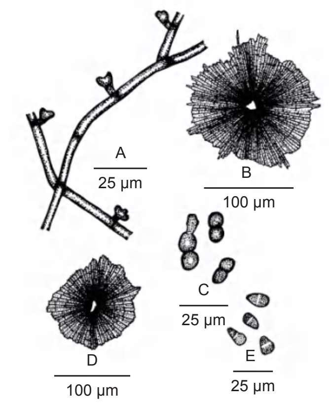 A.菌丝体;B.盾状囊壳;C.子囊孢子;D.分生孢子器;E.器孢子