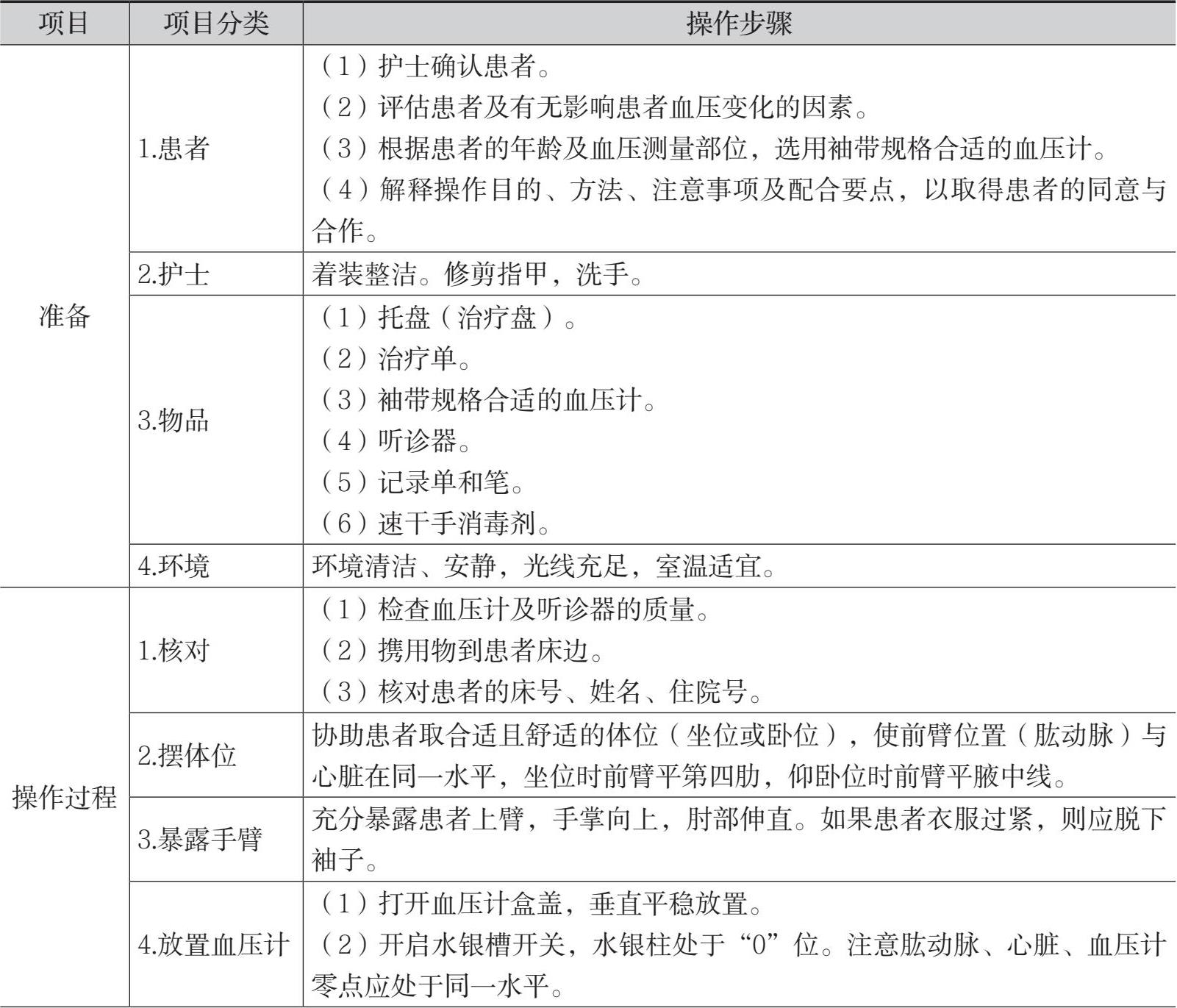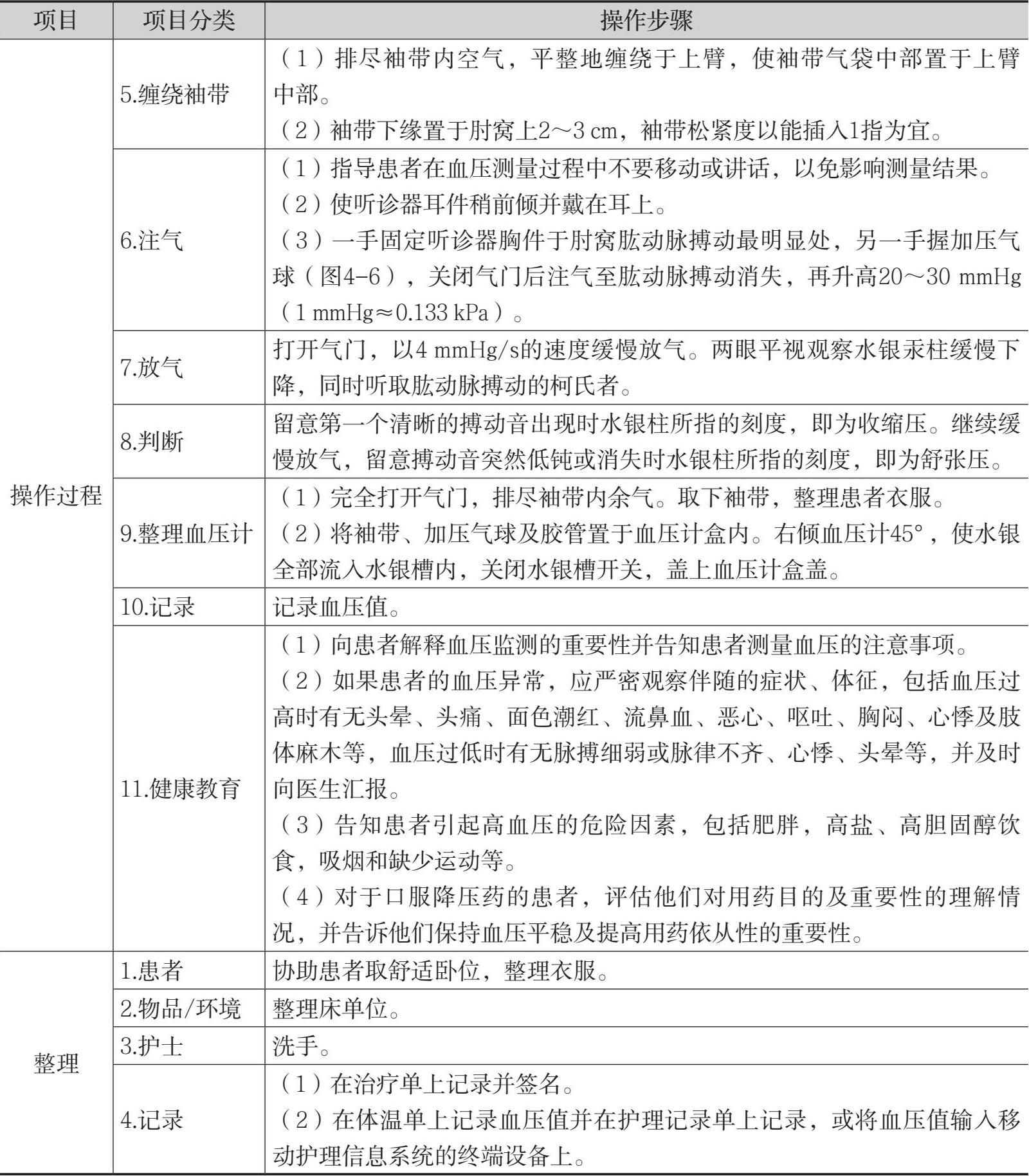 5.发现搏动音听不清或血压异常时,应间隔1~2 min后重新测量。重测时,应排尽袖带内的气体,待水银柱降至“0”位,稍等片刻后再测量。必要时双侧对照。