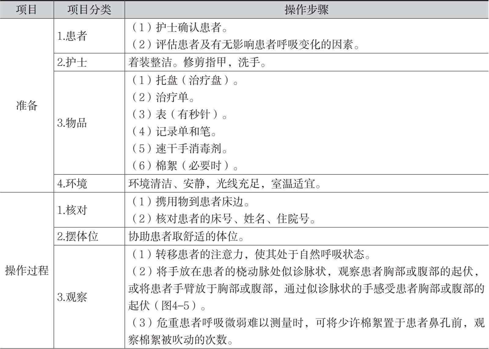 3.危重患者呼吸微弱难以测量时,可将少许棉絮置于患者鼻孔前,观察棉絮被吹动的次数,计时1 min。