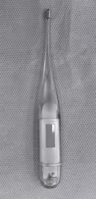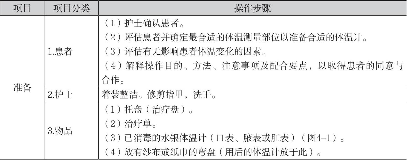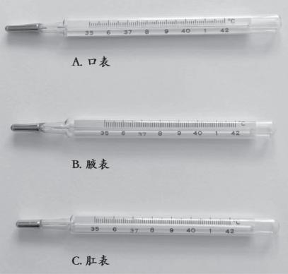 操作补充说明:a.电子体温计以安全、测温速度快的优点,广泛用于临床发热筛查。b.常用的有电子体温计(图4-2)、多功能红外线体温计(耳温或额温)(图4-3);有片式、笔式、枪式、奶嘴式、穿戴式体温持续监测仪。c.电子体温计的示值准确度受电子元件及电池供电状况等因素影响;额温计易受环境温度(包括出汗、吹风扇、开空调等)的影响;中耳炎患者因为耳道里有液体会大大影响耳温计的精度。d.水银体温计测量稳定性好,但易破碎、存在水银污染的可能、测量时间长。e.水银体温计使用前需检查性能,检测方法为将全部体温计的水银柱甩至35℃以下,于同一时间放入已测好温度的40℃以下的水中,3 min后取出检查;将误差在0.2℃以上、玻璃管有裂痕、水银柱自行下降的视为不合格;合格体温计用纱布擦拭,放入清洁容器内备用。