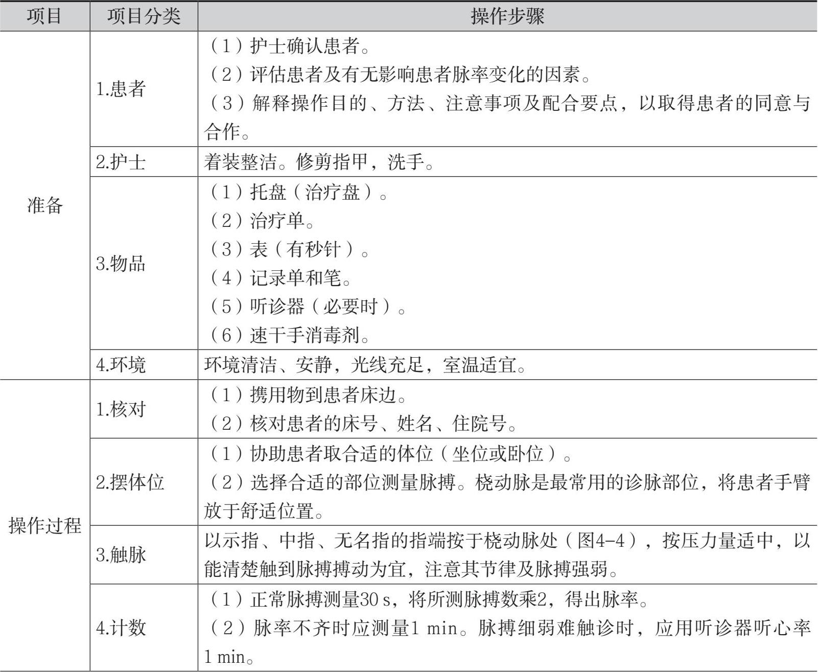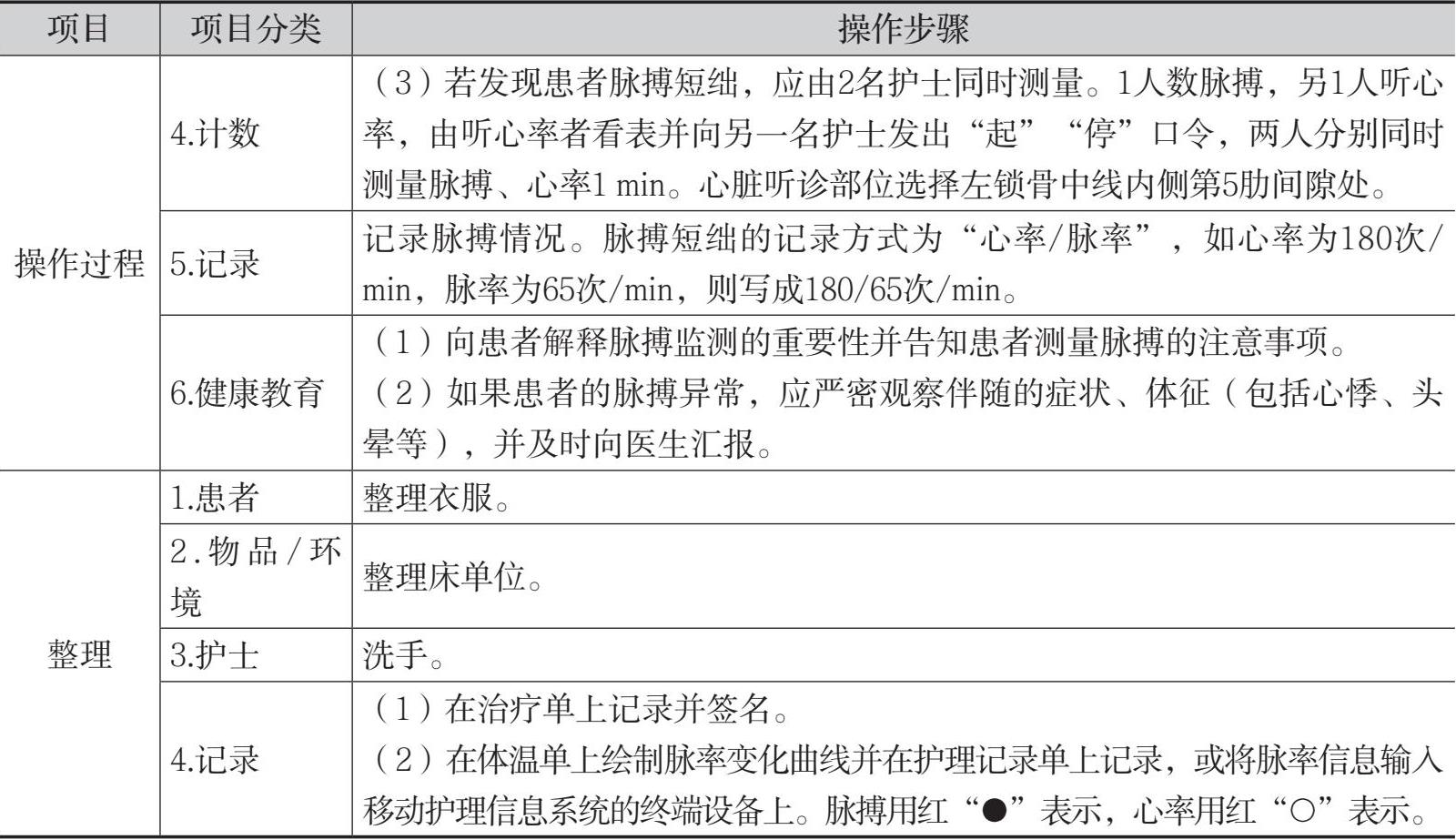 4.脉率不齐时应测量1 min。脉搏细弱难触诊时,应复测心率1 min。若发现患者脉搏短绌,应由2名护士分别同时测量心率和脉率,计时1 min。心脏病、心律不齐、使用洋地黄类药物的患者应测量心率,测量时应注意脉律、脉搏强弱等情况。