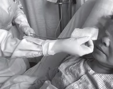 (2)嘱患者深呼吸,在患者呼气时拔管,到咽喉处快速拔出。
