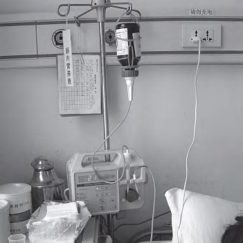 图6-9 应用肠内营养泵输注肠内营养,输液架上挂“肠内营养液”的标志