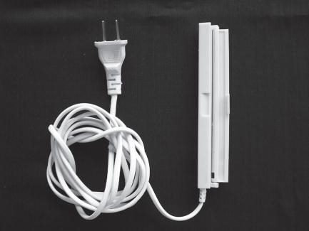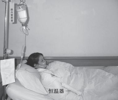 11.将恒温器(图6-7)安装在肠内营养输注器上,插上电源,温度设为38~40℃。恒温器使用时应裹上治疗巾以防烫伤患者。打开管夹。