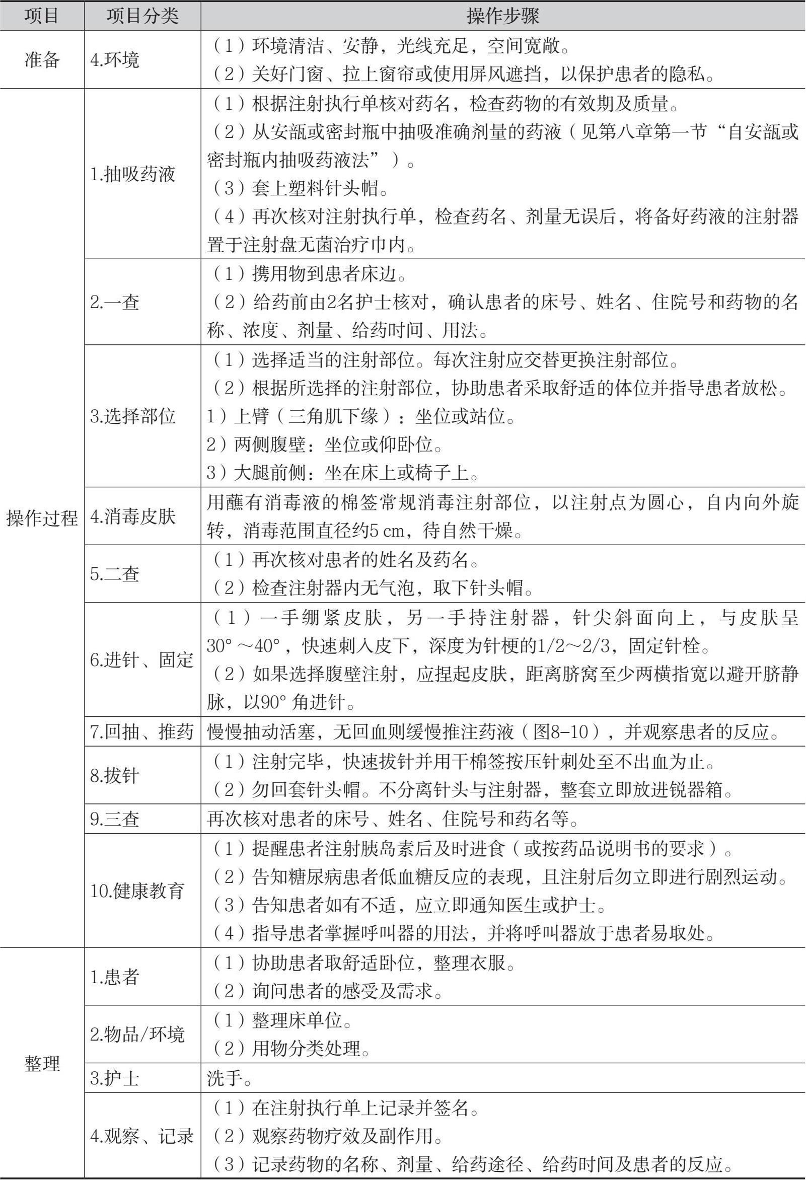 表8-3 皮下注射法的操作流程