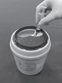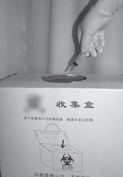 图8-24 注射器与针头使用后不回套针头帽并立即放进锐器箱