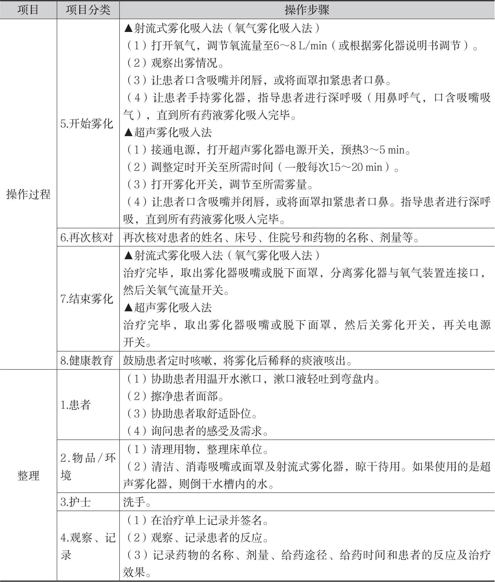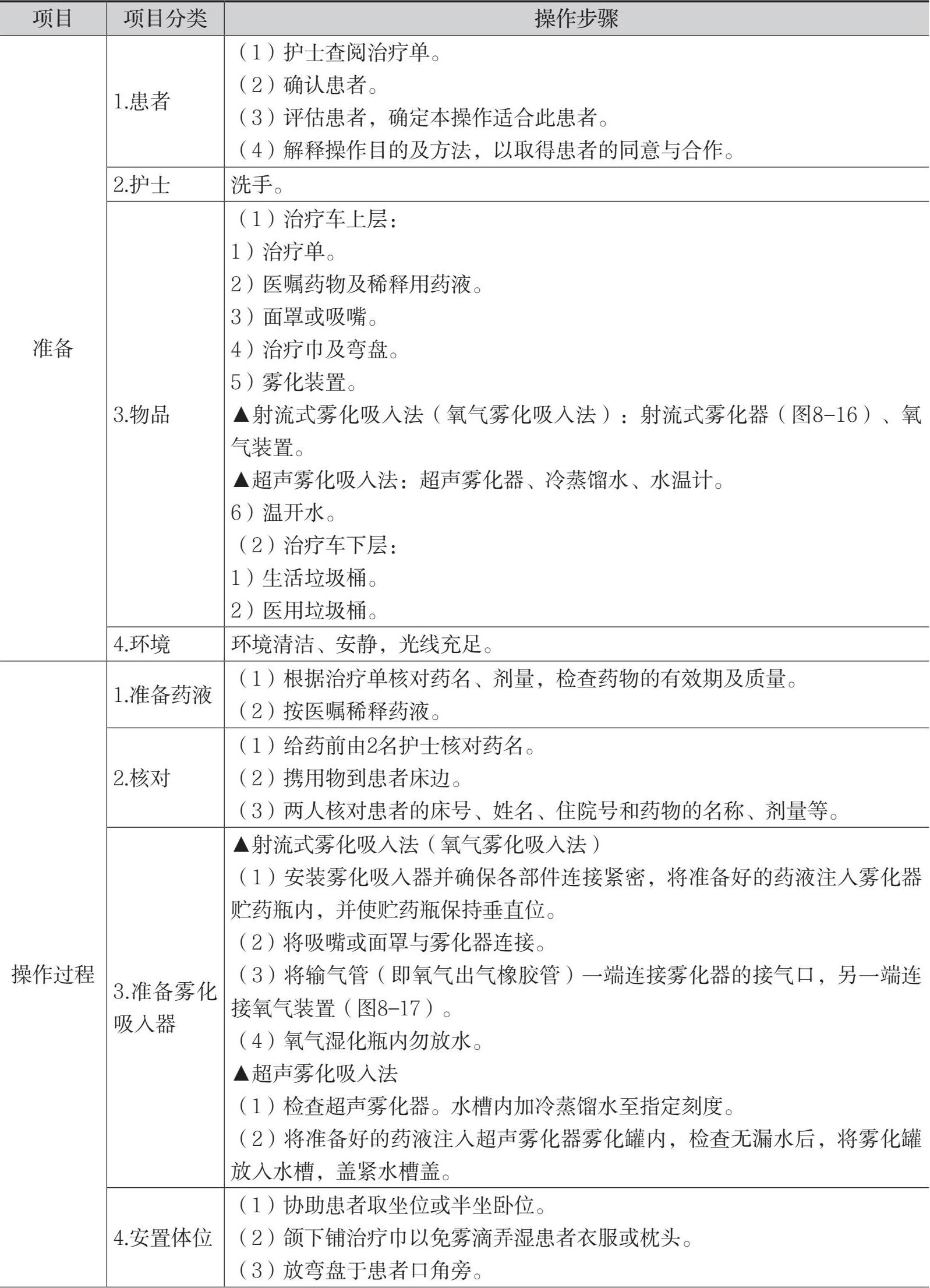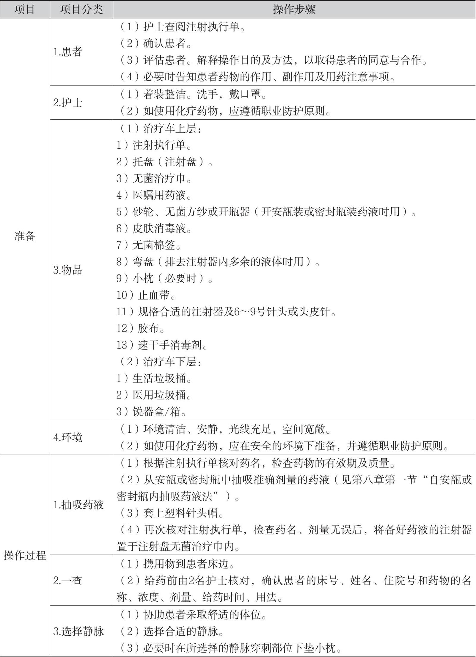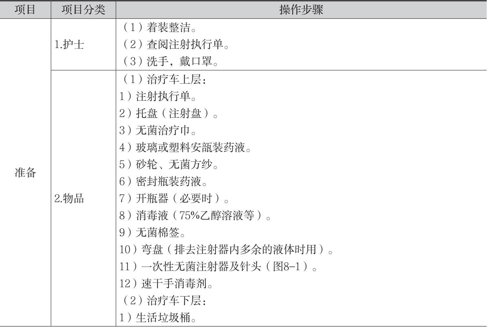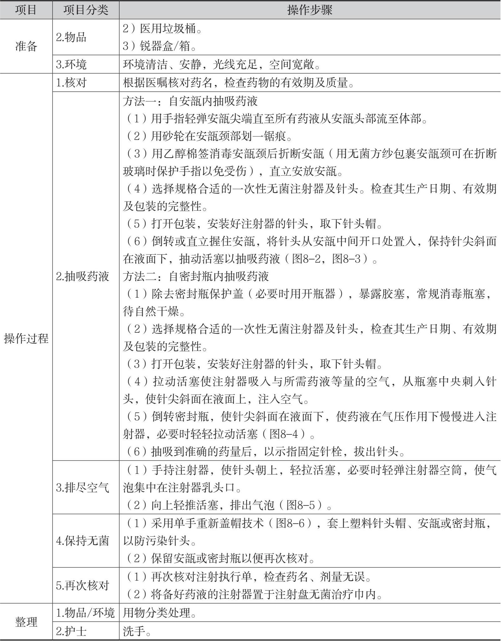 表8-1 自安瓿或密封瓶内抽吸药液法的操作流程