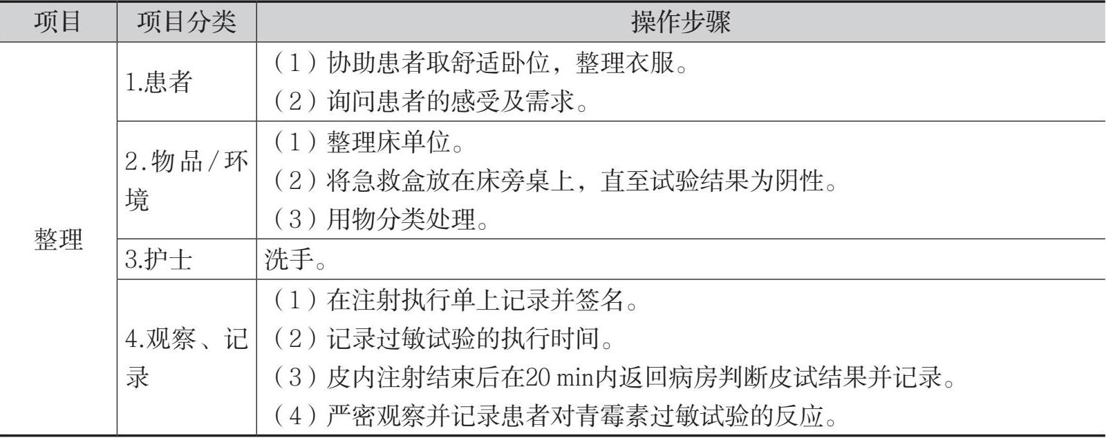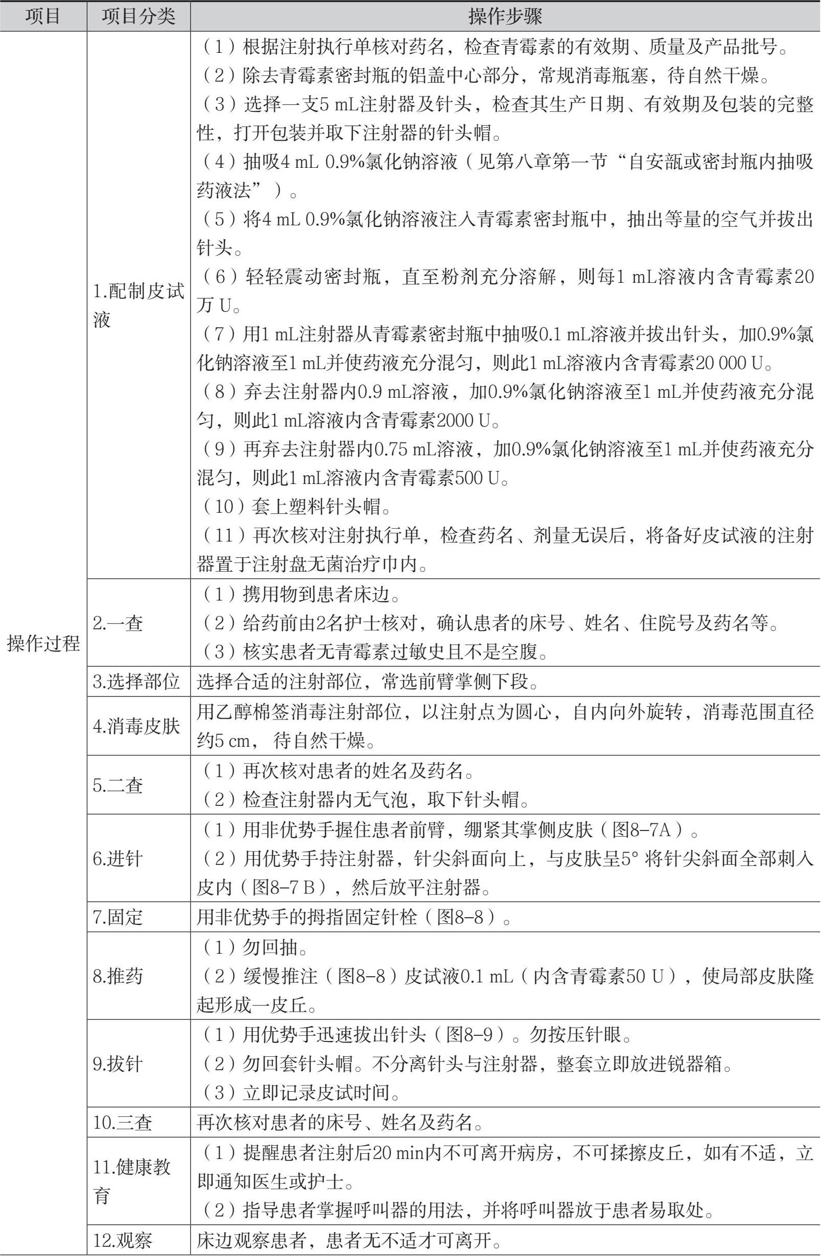 表8-2 皮内注射法(青霉素过敏试验)的操作流程