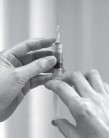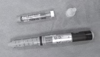 8.进针前注射器内吸入0.2~0.3 mL空气。针头向下时,气泡将走向注射器内溶液的顶部。