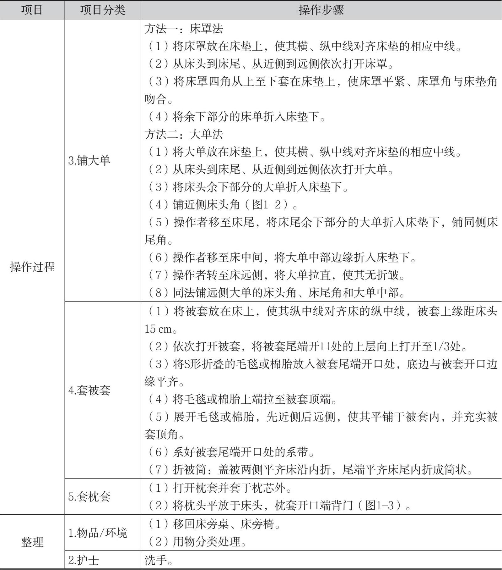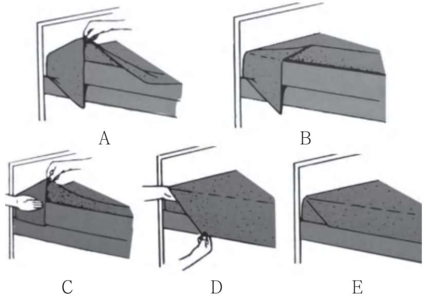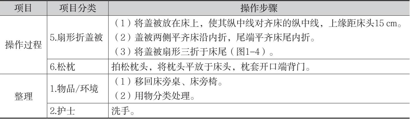 操作补充说明:为新入院患者准备的暂空床与备用床(图1-3)的铺法一致,只是暂空床的盖被扇形折叠于床尾(图1-4),以方便住院患者上床。