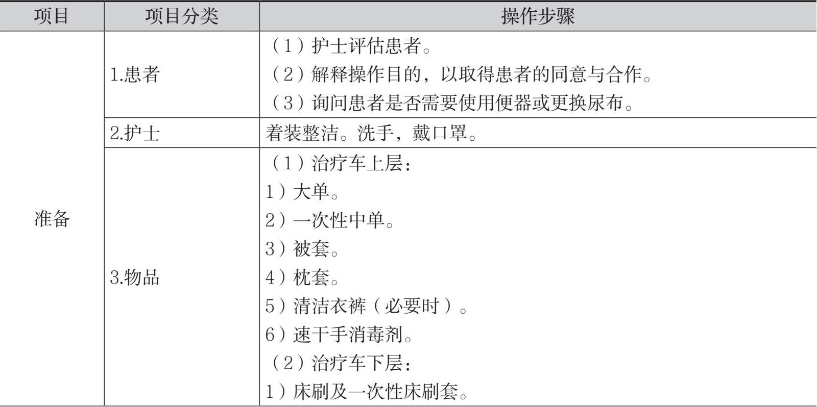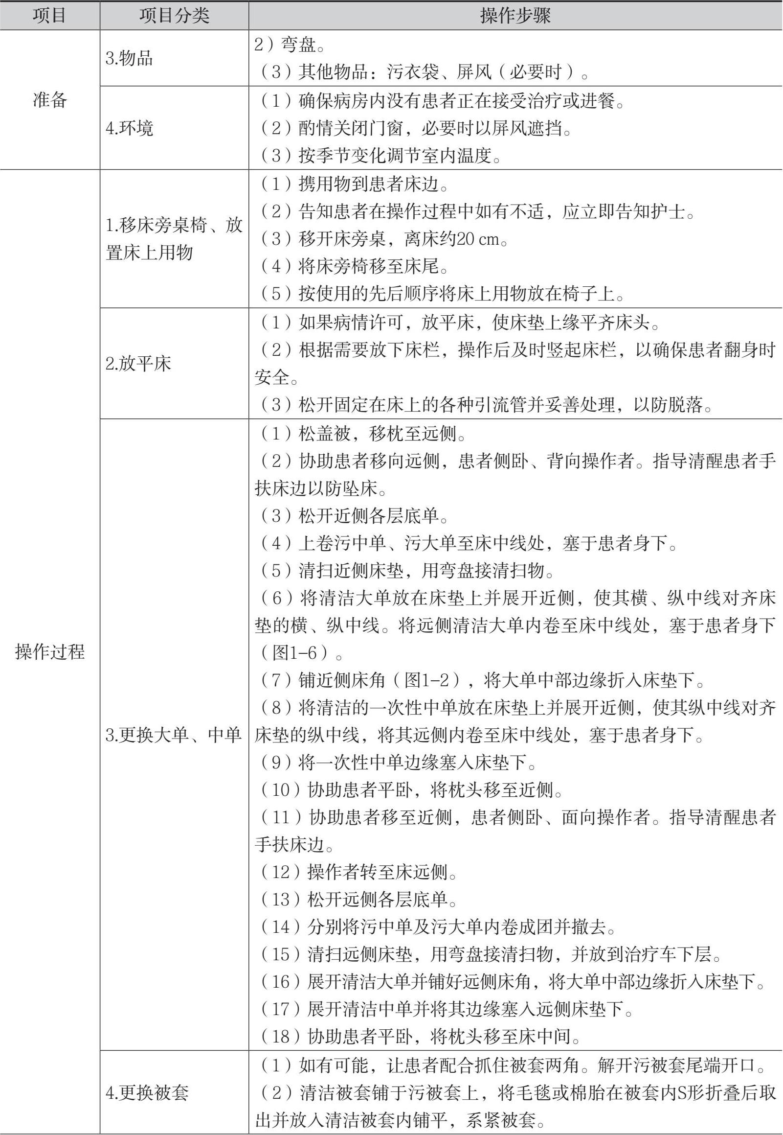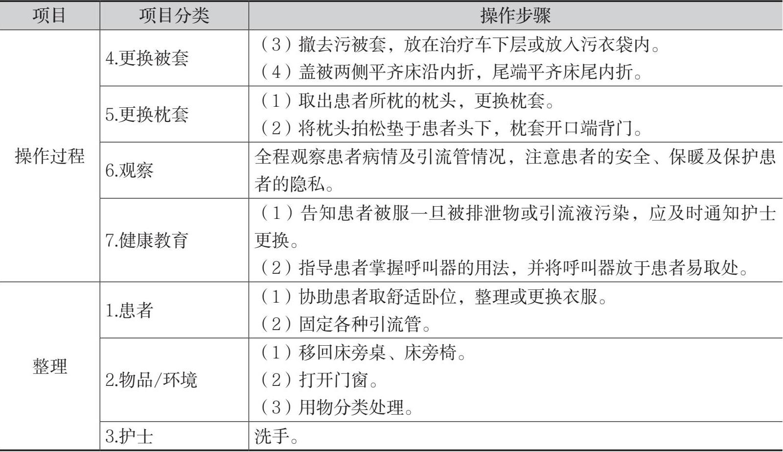 操作补充说明:如果使用橡胶单,则上卷污中单后清扫橡胶单并搭橡胶单于患者身上,铺好清洁大单后铺平橡胶单并铺清洁中单,将近侧橡胶单和中单边缘塞入床垫下;远侧取出污中单后亦清扫橡胶单并搭橡胶单于患者身上,铺好远侧清洁大单后放平橡胶单并取出清洁中单,最后将远侧橡胶单和中单边缘塞入床垫下。