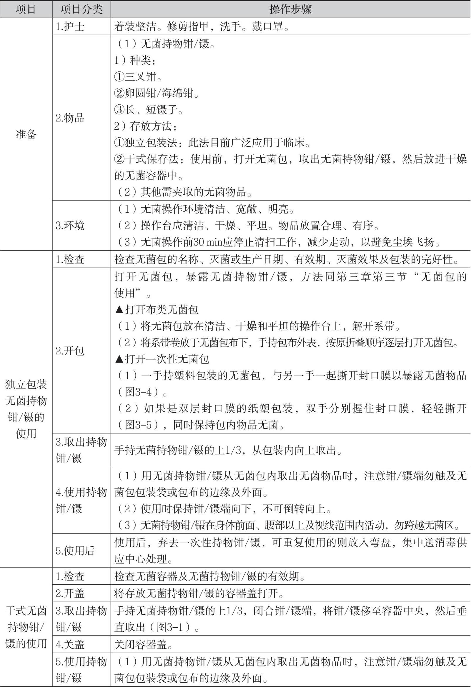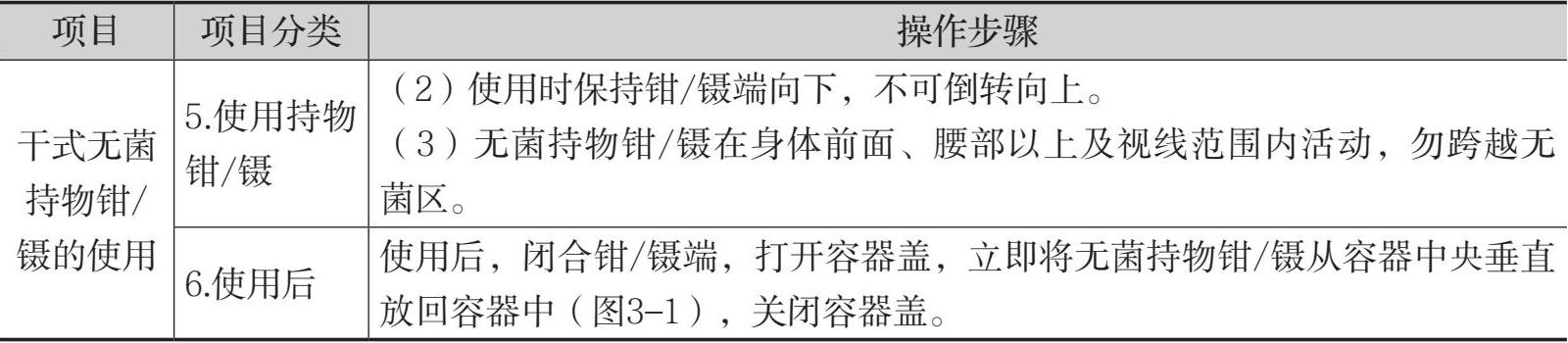 表3-1 使用无菌持物钳/镊的操作流程