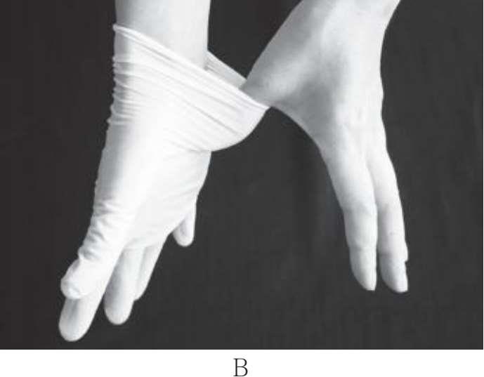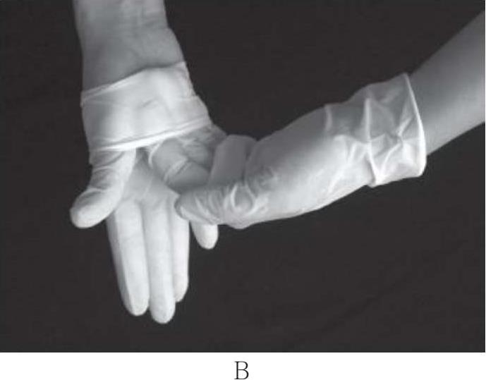 3.戴无菌手套时,未戴手套的手不可触及手套的外面,已经戴好手套的手不可触及未戴手套的手及另一手套的内面。