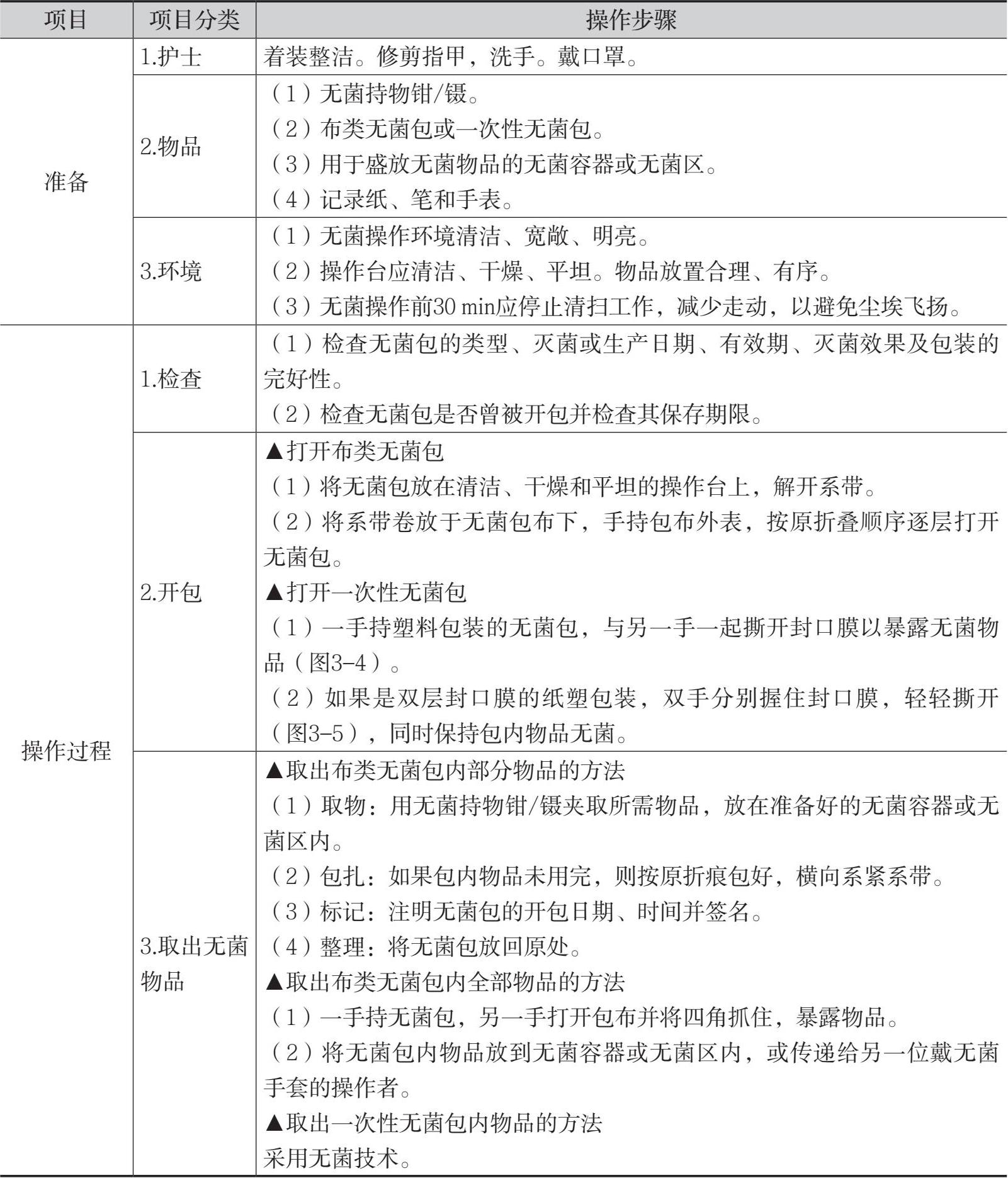 表3-3 使用无菌包的操作流程