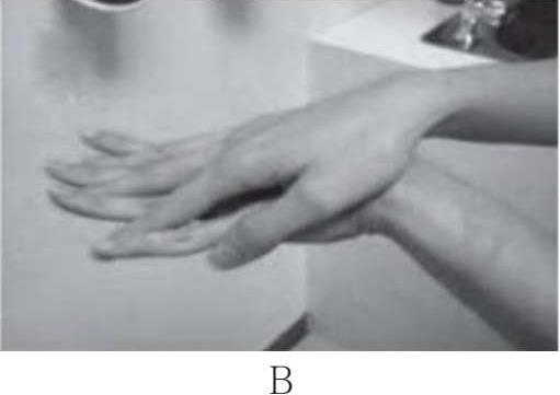 (2)掌心对手背,手指交叉沿指缝相互揉搓,两手交替。